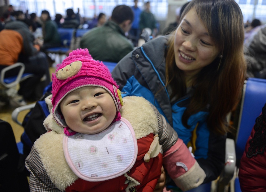 | Hai mẹ con đang đợi tàu tại ga Hàng Châu ngày 7/1. Ảnh: Tân Hoa xã. |