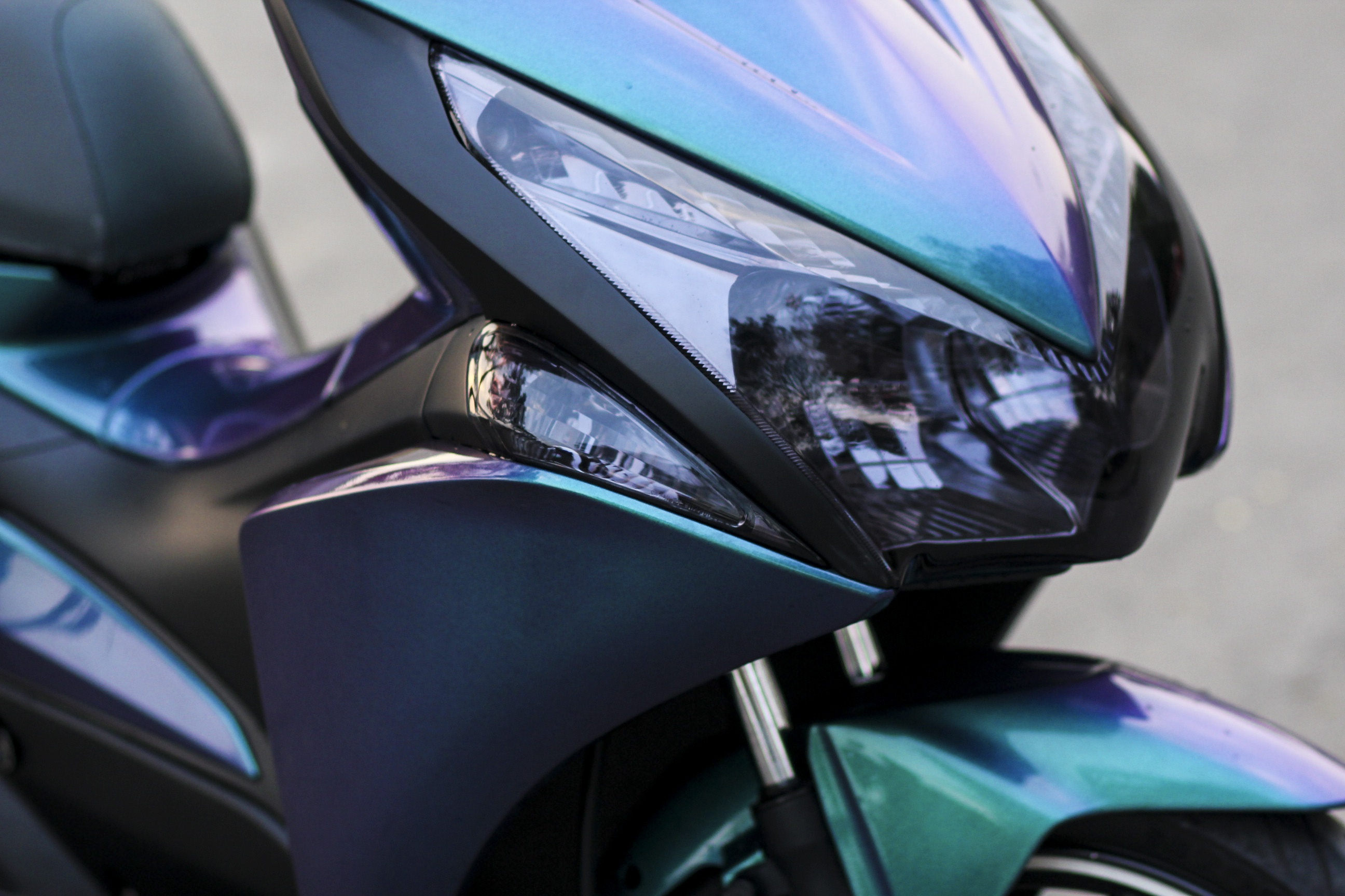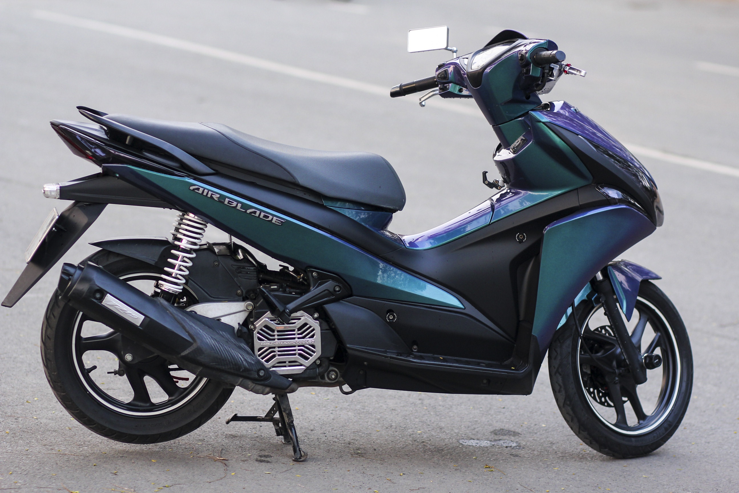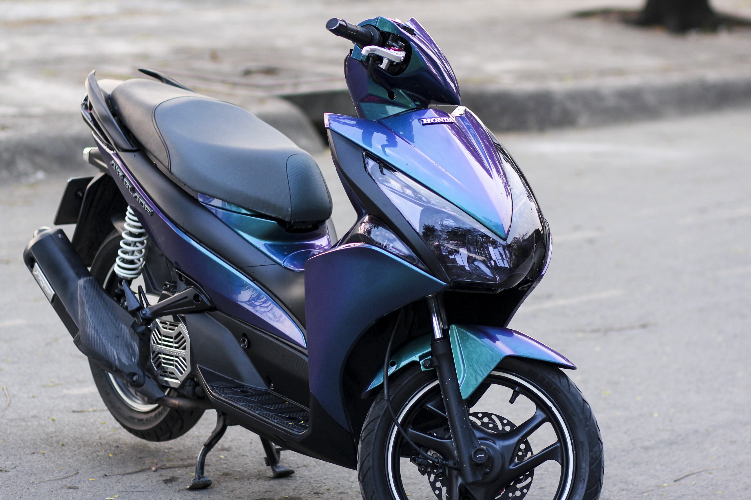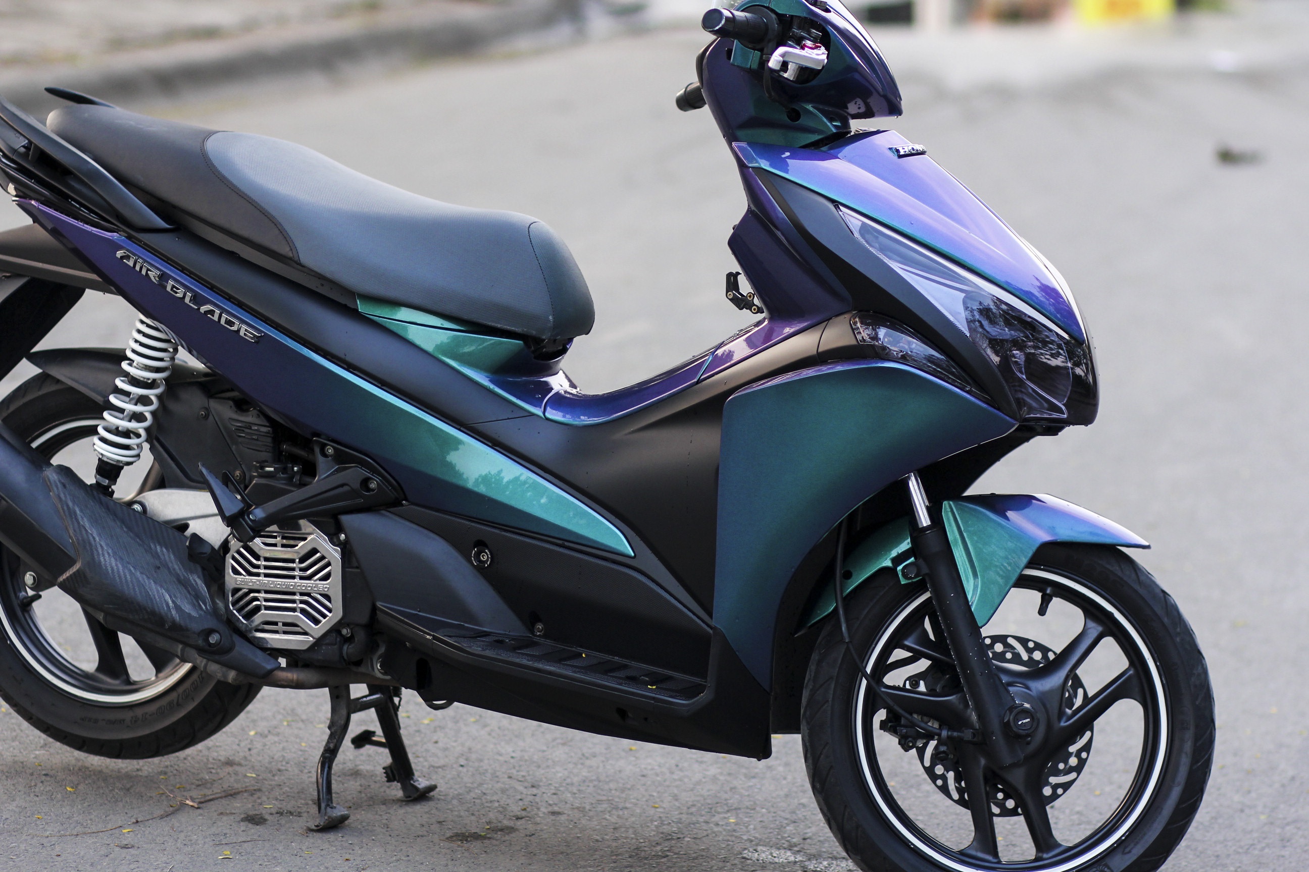 | Chiếc Honda Air Blade 110 nguyên bản màu đỏ. Do kiểu dáng trông khá già nên chủ nhân của nó quyết định độ lại màu sơn có thể chuyển màu theo góc nhìn. |