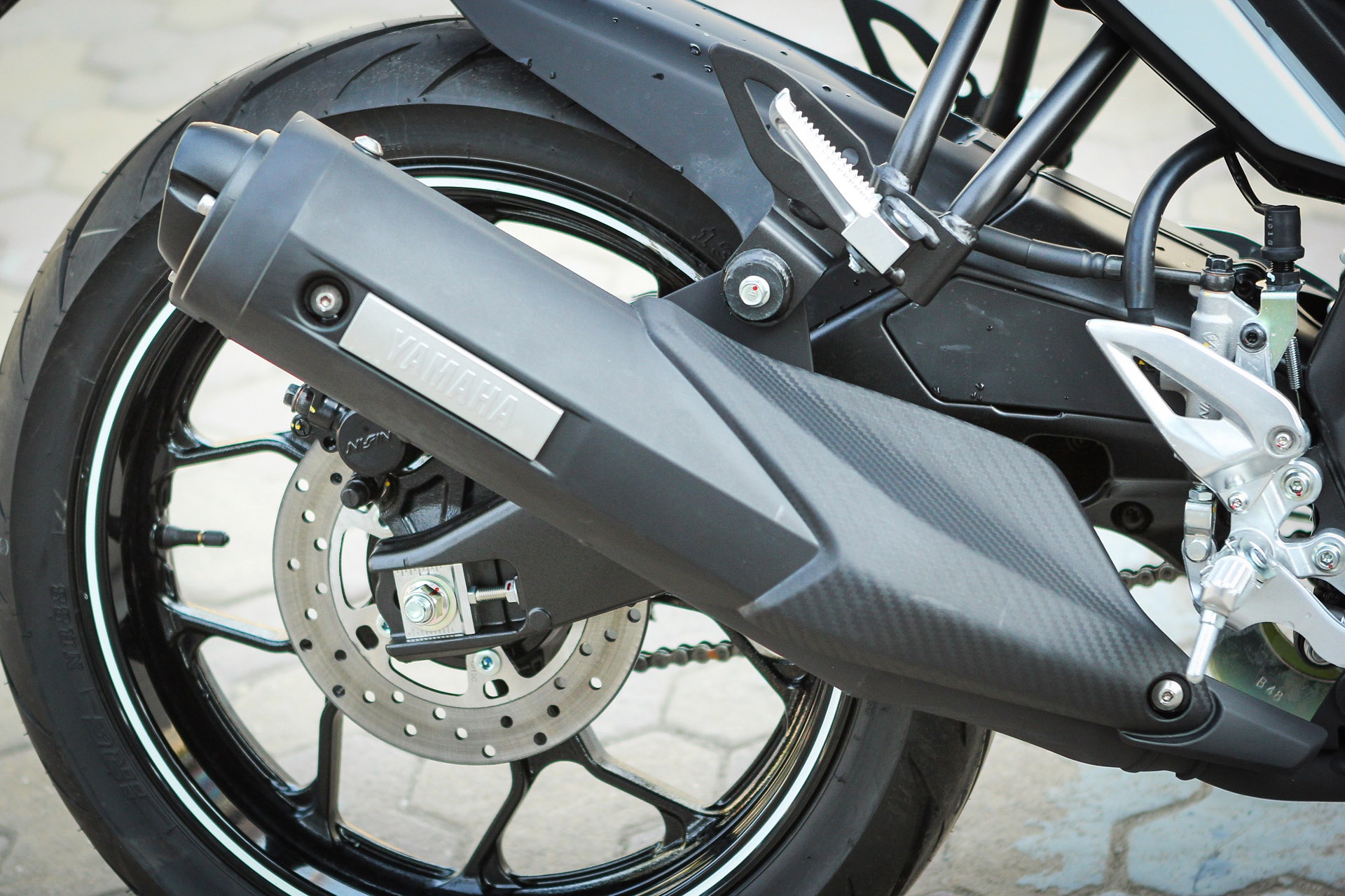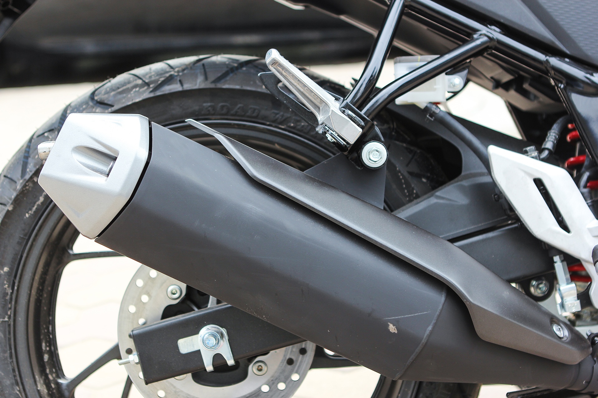 | Thiết kế ống xả của M-Slaz và CB150R. Cả hai đều trang bị giảm xóc dạng monoshock phía sau. Thiết kế gắp sau của M-Slaz ấn tượng hơn so với đối thủ từ Honda. |