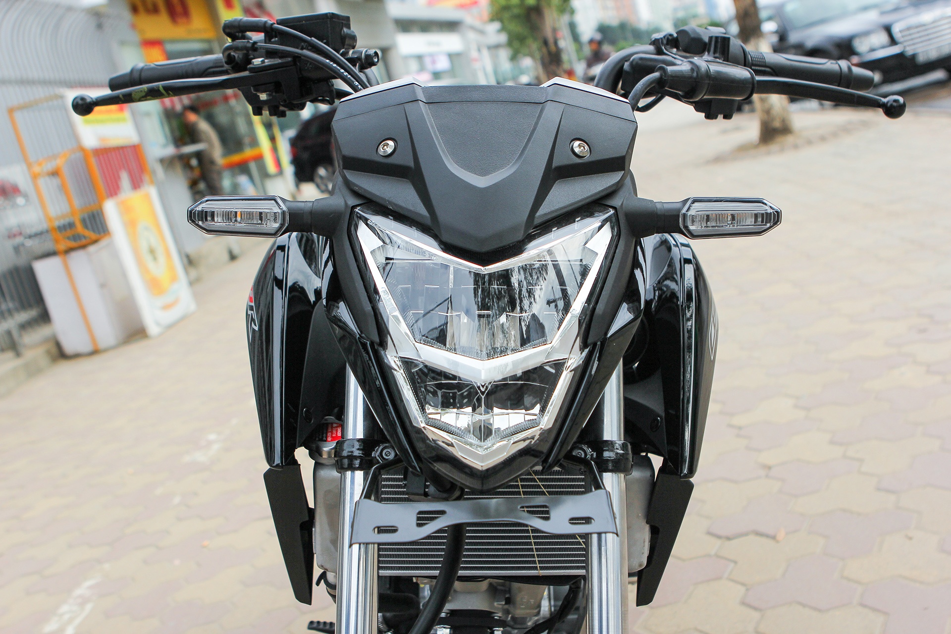 | Thiết kế đầu xe của Yamaha M-Slaz có phần hầm hố hơn so với thiết kế của Honda CB150R. Cả 2 mẫu naked bike đều sử dụng đèn pha LED và có đèn định vị ban ngày. |