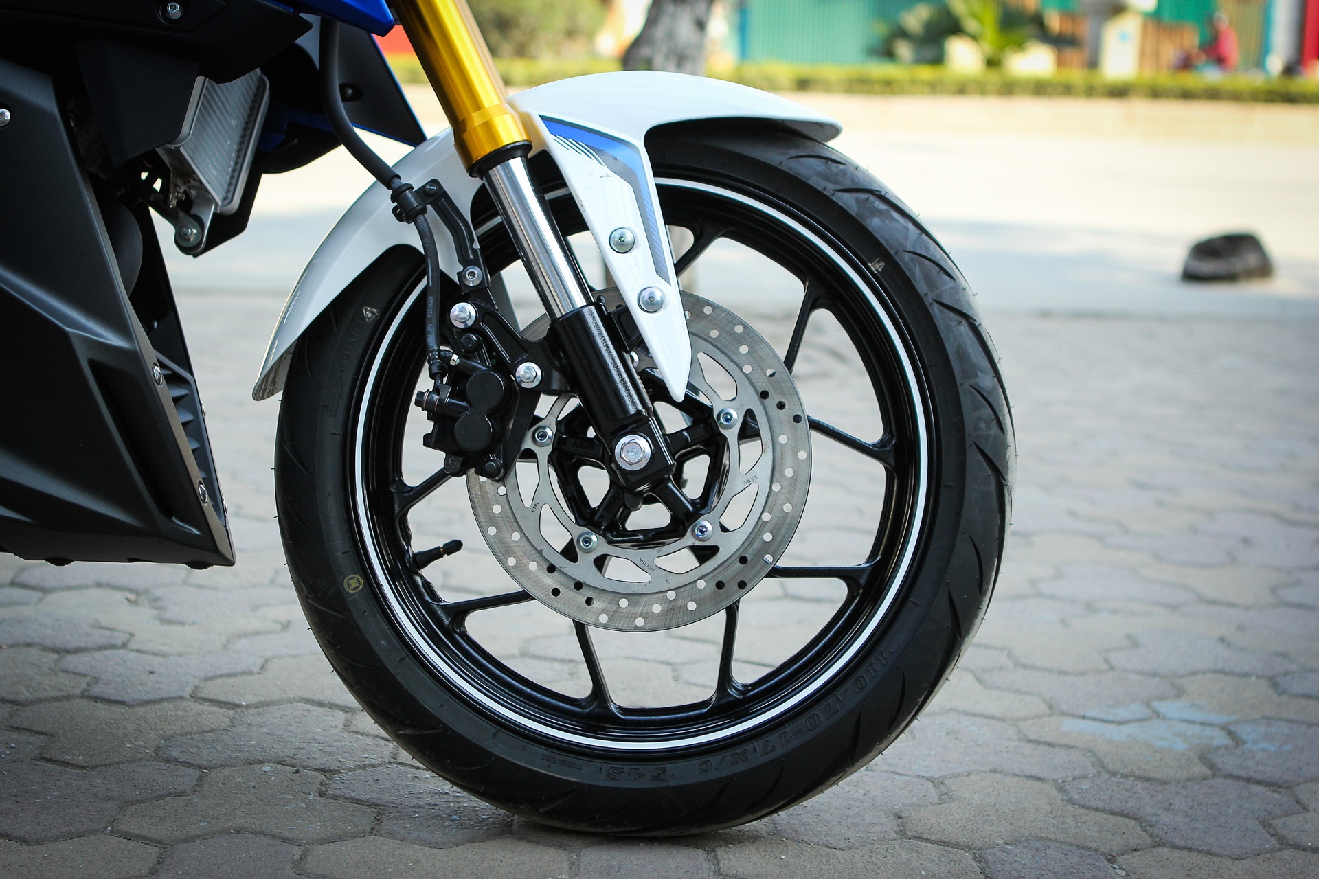 | Cả M-Slaz và CB150R đều được trang bị phanh đĩa phía trước, cùng vành xe 17 inch. Lốp trước trên naked bike của Yamaha có kích thước 110/70-17, trong khi của Honda là 100/80-17. M-Slaz được đánh giá cao hơn về tính thể thao với giảm xóc hành trình ngược. |