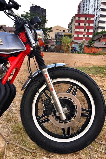 | Xe trang bị bánh sau 500-16, bánh trước 400-19 kết hợp với cặp lốp Firestone cỡ lớn có nhiều rãnh. |