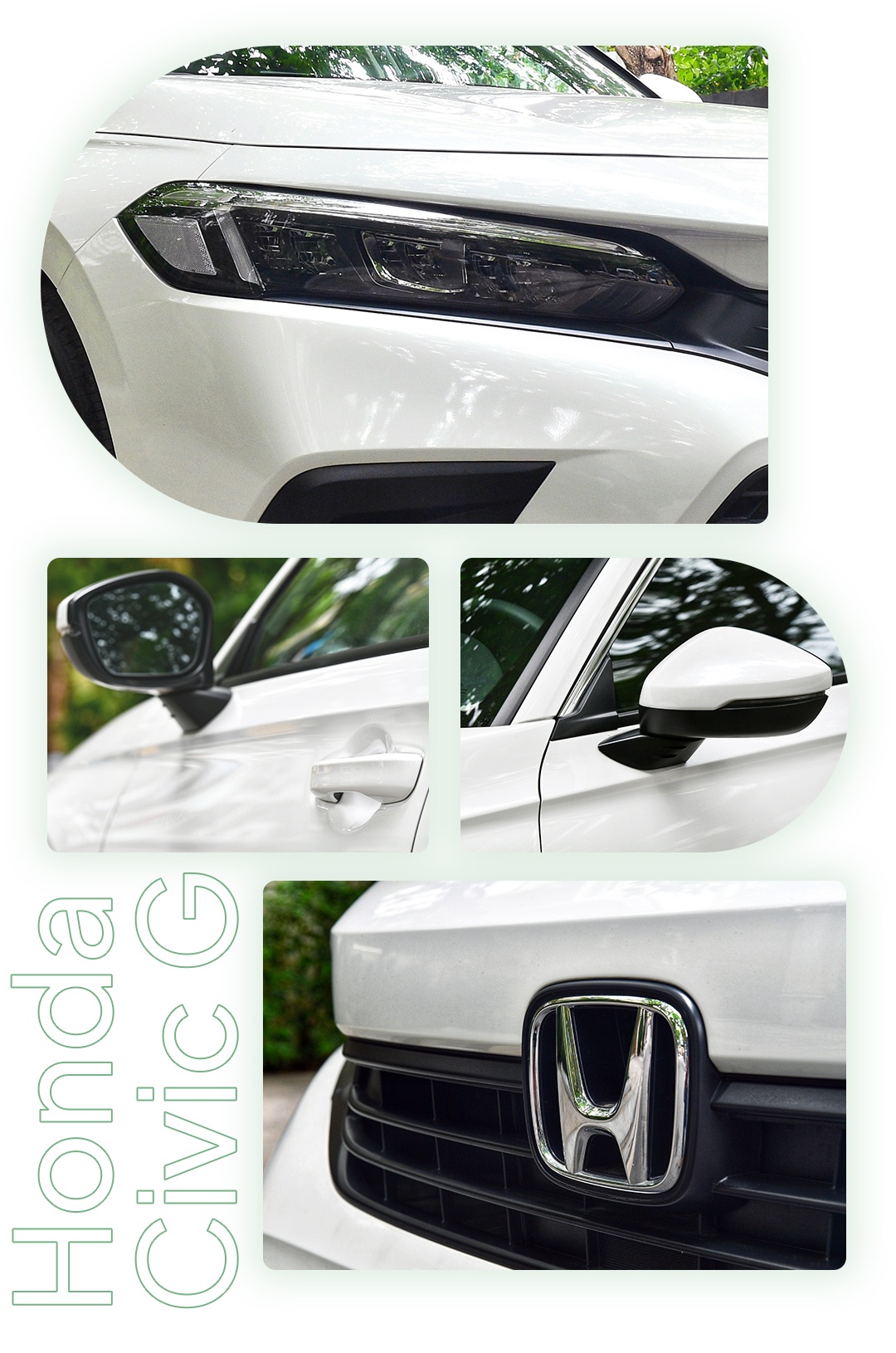 Phần đầu Honda Civic G nổi bật với lưới tản nhiệt kết hợp cùng dải đèn định vị ban ngày tạo hình móc câu ấn tượng. Phiên bản này sở hữu hệ thống đèn LED chiếu sáng hiện đại, đi kèm là công nghệ AHB (đèn pha thích ứng tự động) giúp người dùng không còn lo lắng khi chạy xe vào ban đêm.