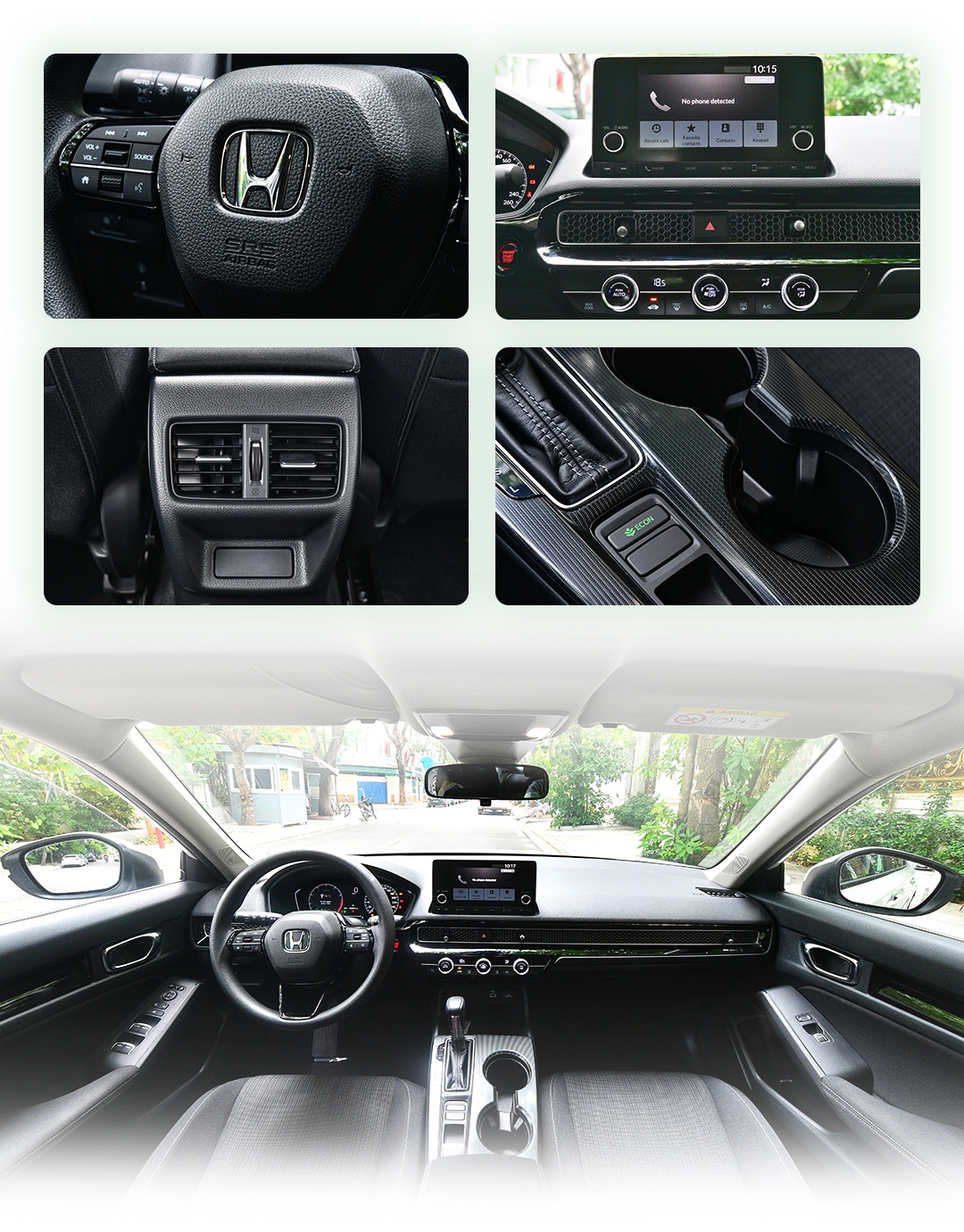 Khu vực phía trước cho cảm giác thời thượng với màn hình giải trí trung tâm đặt cao kết hợp cùng dải khe gió điều hòa họa tiết tổ ong độc đáo. Honda Civic vẫn duy trì các phím cơ điều chỉnh, trang bị này giúp người lái dễ dàng thao tác hơn dạng phím cảm ứng.
