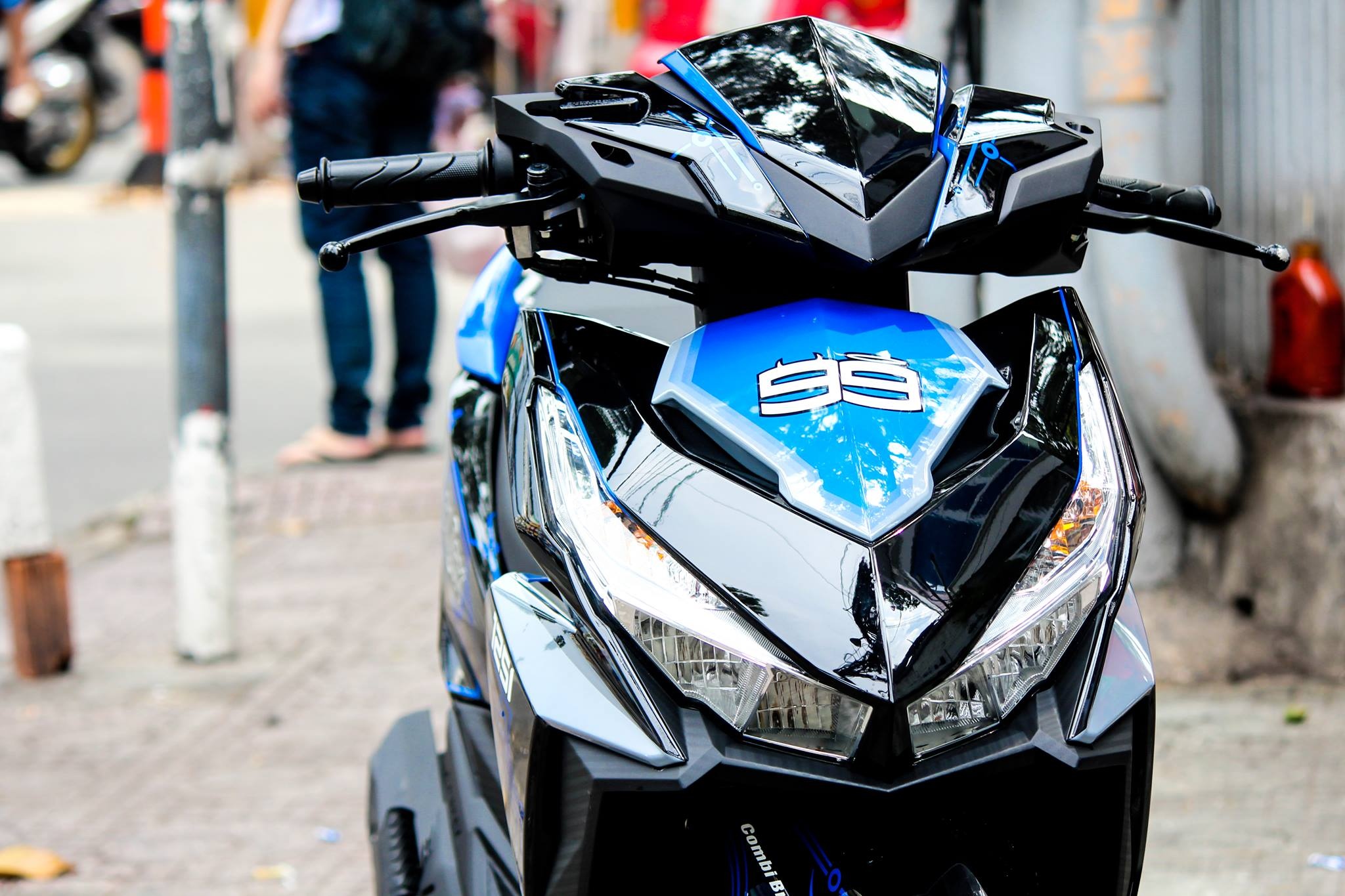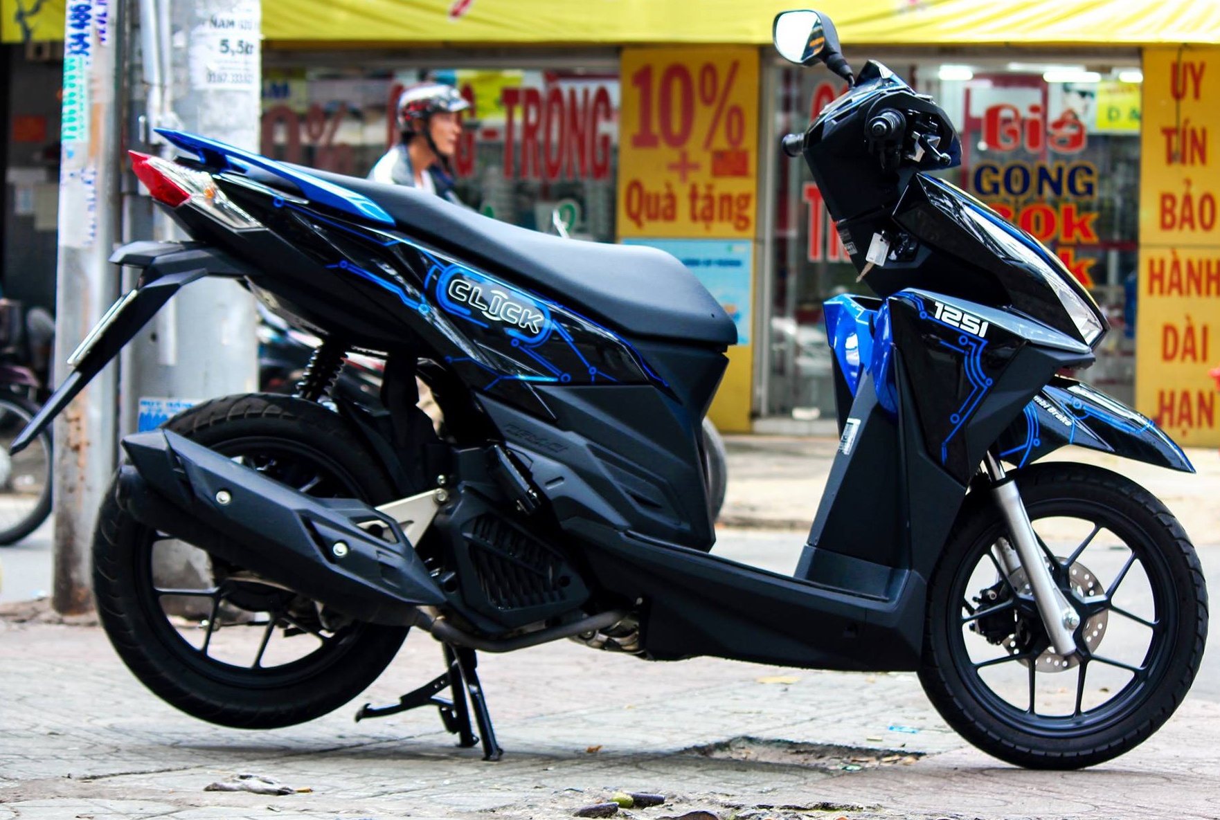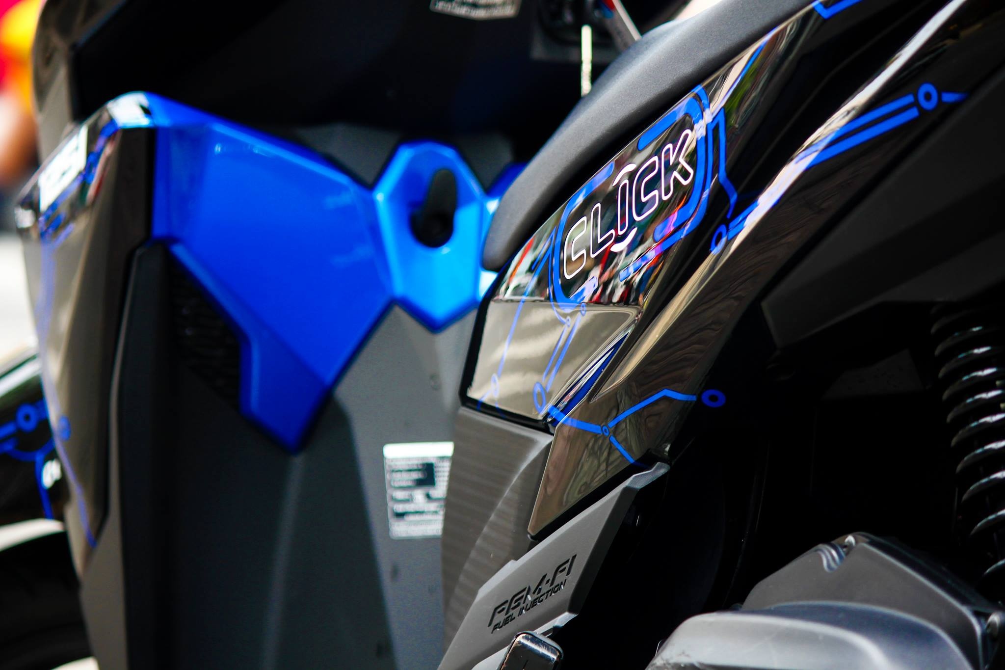 | Chiếc Honda Click 125i 2015 nguyên bản màu đen và thuộc sở hữu của một biker ở Sài Gòn. Dựa trên ý tưởng là bộ phim Tron Legacy, dàn áo của xe, đặc biệt hai bên ốp đuôi và cánh gà được sơn lại với những đường chỉ nổi bật cùng tông màu xanh GP. |