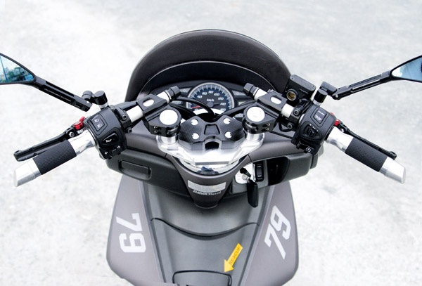 Những phụ kiện đồ chơi cho xe được thay vào khá nhiều và tất cả đều là hàng hiệu Biker của Nhật, như ghi đông thể thao 3 khúc, tay phanh đồ chơi chỉnh 6 chế độ, bao tay lái Japan Speed, ốp pô xe, chụp đuôi xe cũng của Biker.