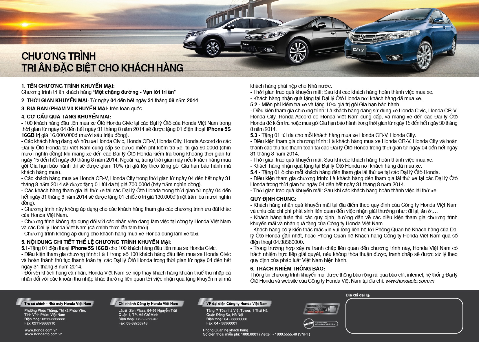 - Với 100 khách hàng đầu tiên mua xe Civic, mẫu xe đầu tiên được Honda Việt Nam sản xuất và cũng là mẫu xe tiên phong đánh dấu sự có mặt của thương hiệu Honda Ô tô tại thị trường Việt Nam, hãng sẽ tặng iPhone 5S phiên bản quốc tế sành điệu và sang trọng.