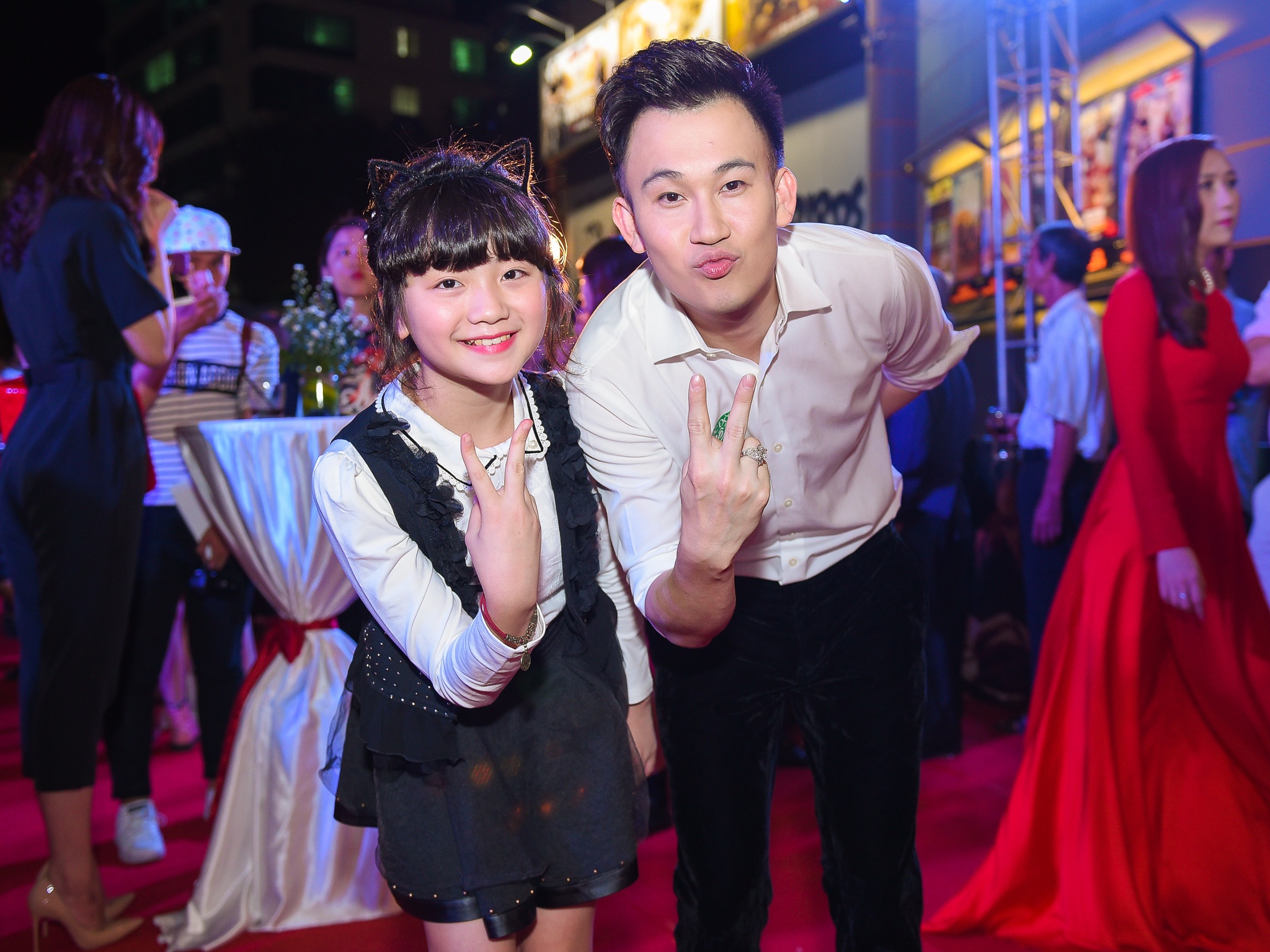 Nam ca sĩ thích thú chụp ảnh cùng diễn viên nhí Kim Anh. |