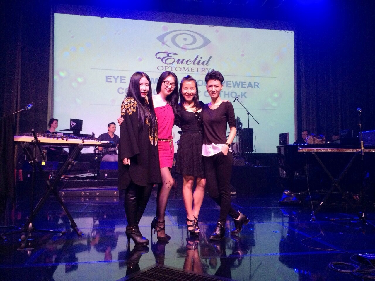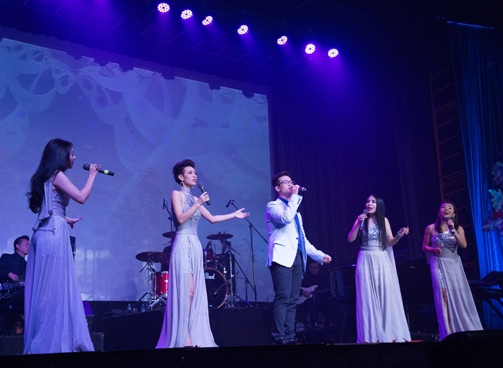 | Nhóm 5 Dòng Kẻ và ca sĩ Hồng Ngọc lúc tổng duyệt chương trình. |