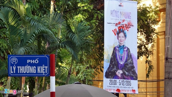 | Băng rôn liveshow của ca sĩ Hồng Nhung bị đóng dấu "Quảng cáo vi phạm" ở Hà Nội. |