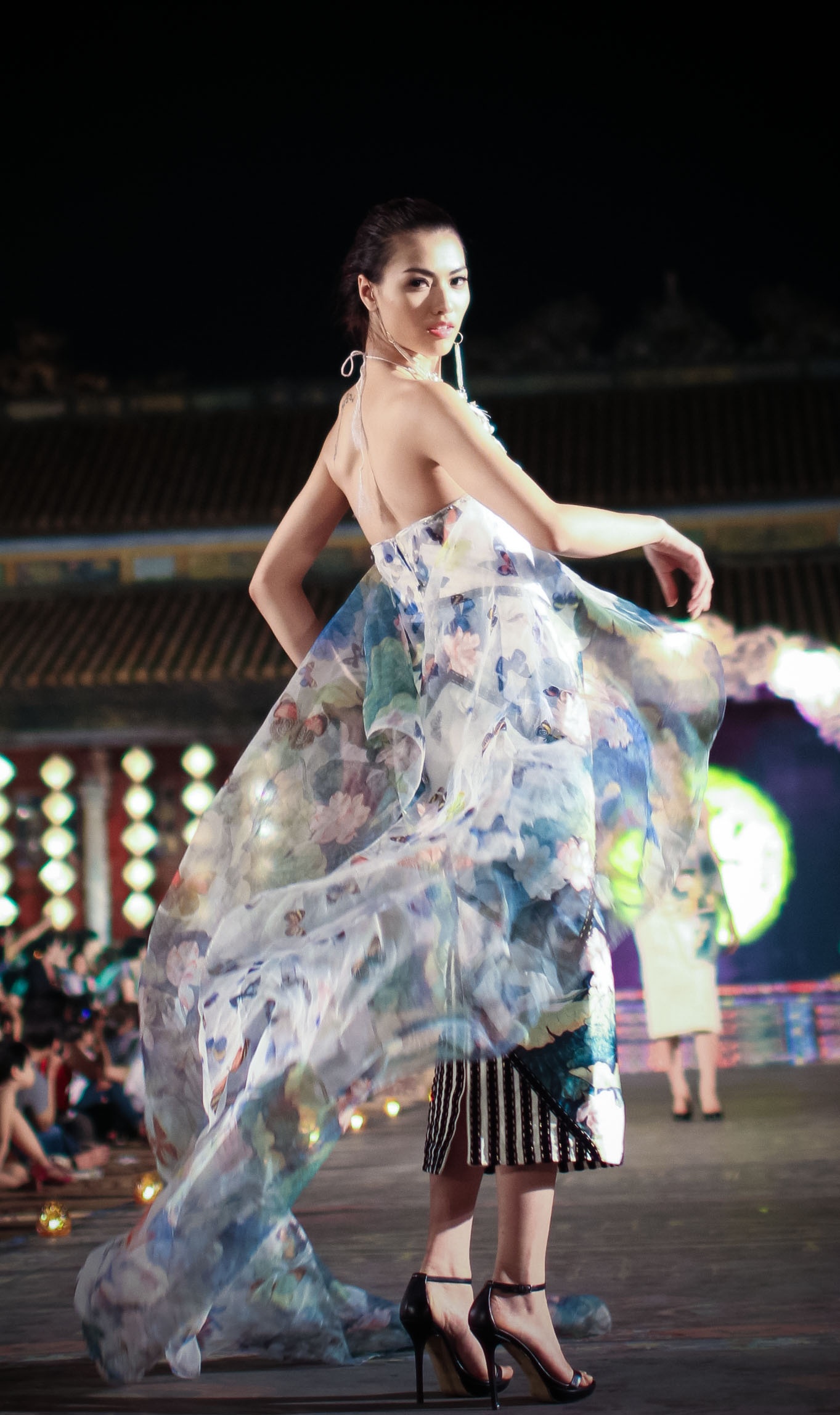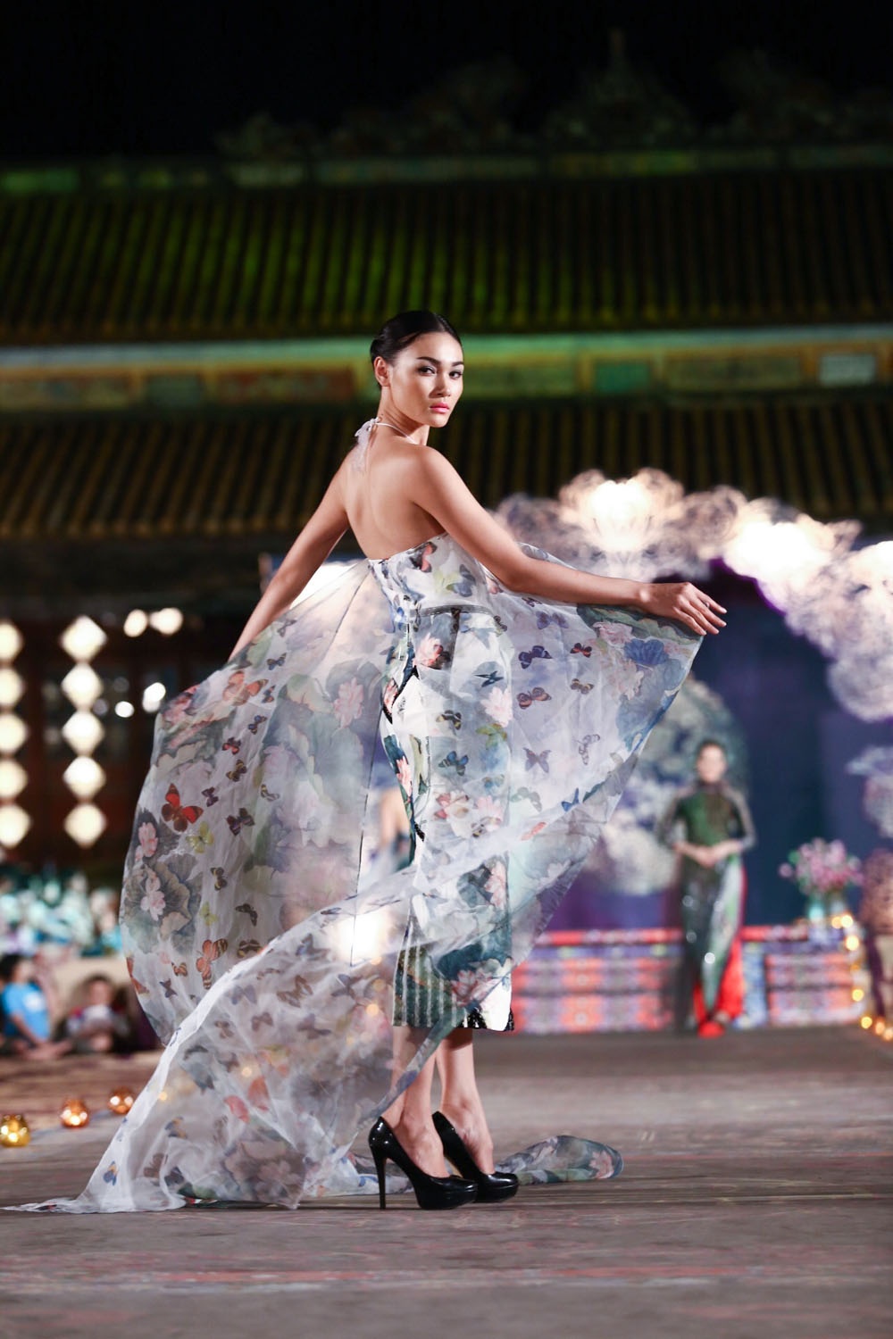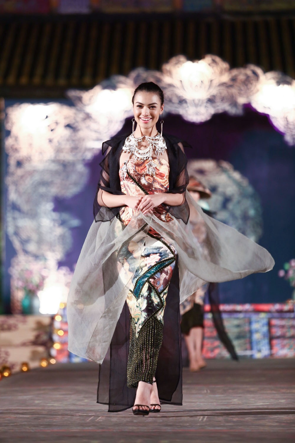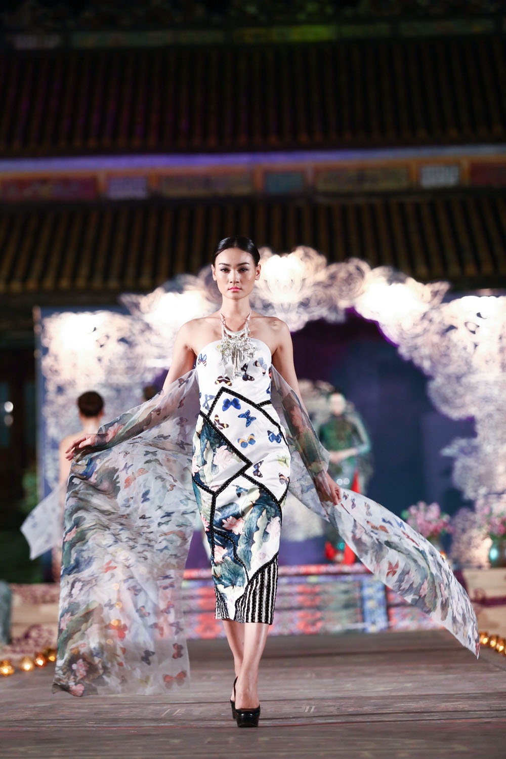Kết hợp cùng mẫu váy cổ điển là những chiếc áo khoác lụa bay bổng và duyên dáng.