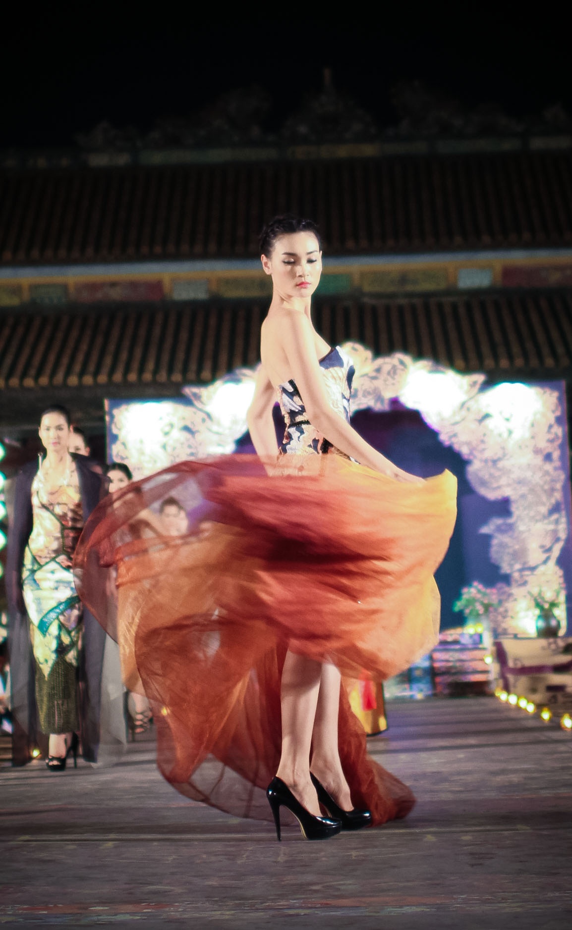 | Hồng Quế được NTK Công Khanh ưu ái khi đảm nhận trình diễn 3 mẫu váy truyền thống mà anh tâm đắc nhất. Cô tự tin với mẫu váy gam màu cam ấm áp. |