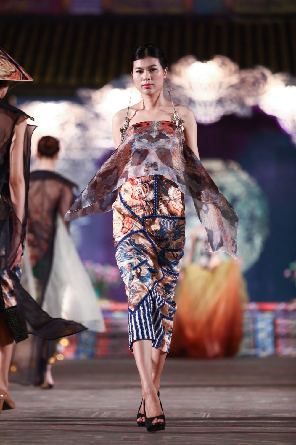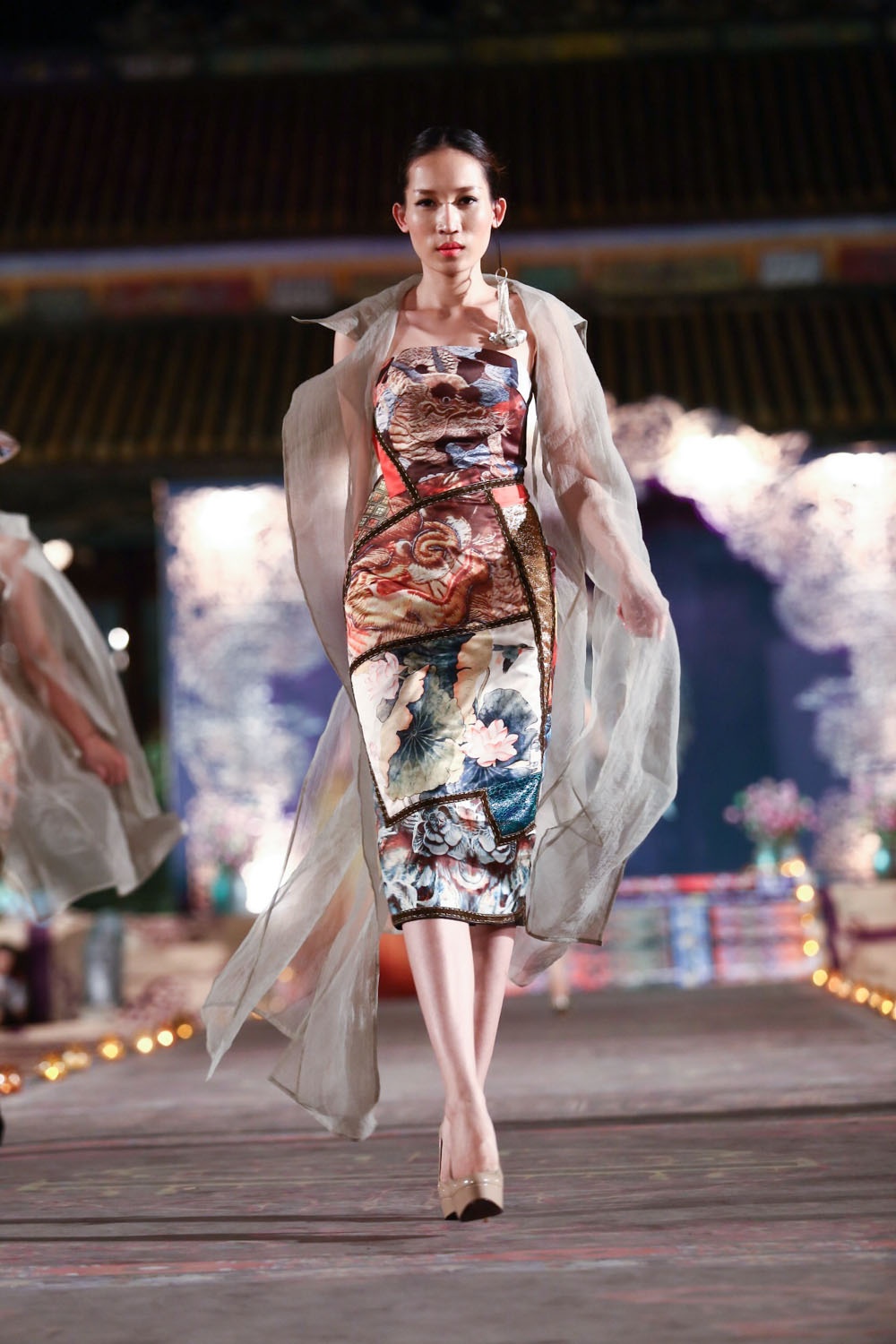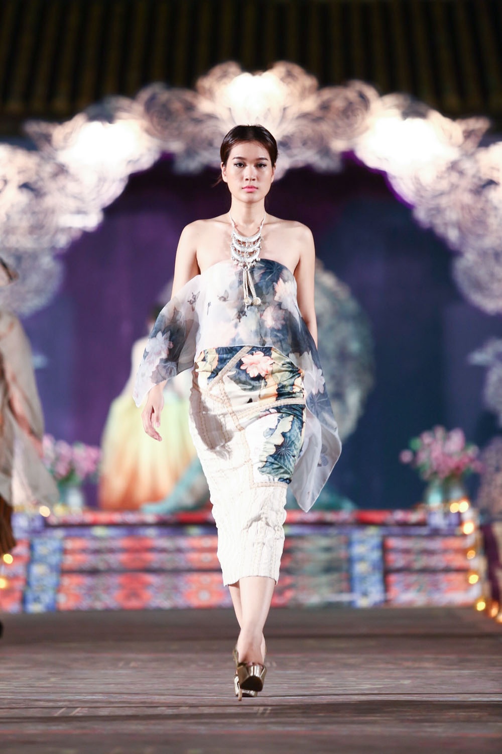 Họa tiết hoa sen trên chất liệu lụa truyền thống của Công Khanh được đông đảo bạn bè quốc tế tham dự đêm diễn đánh giá cao và yêu thích.