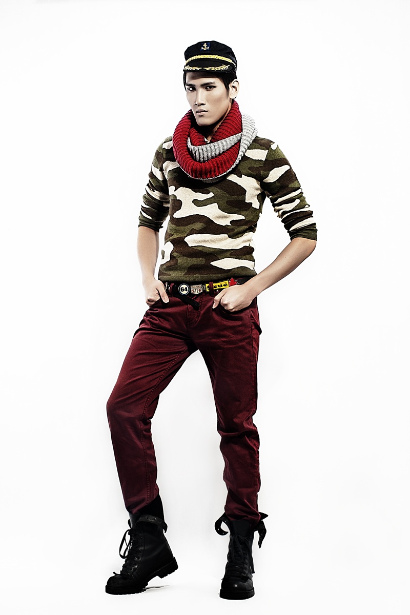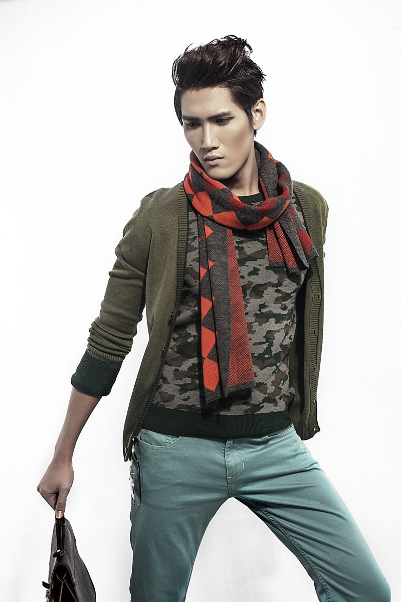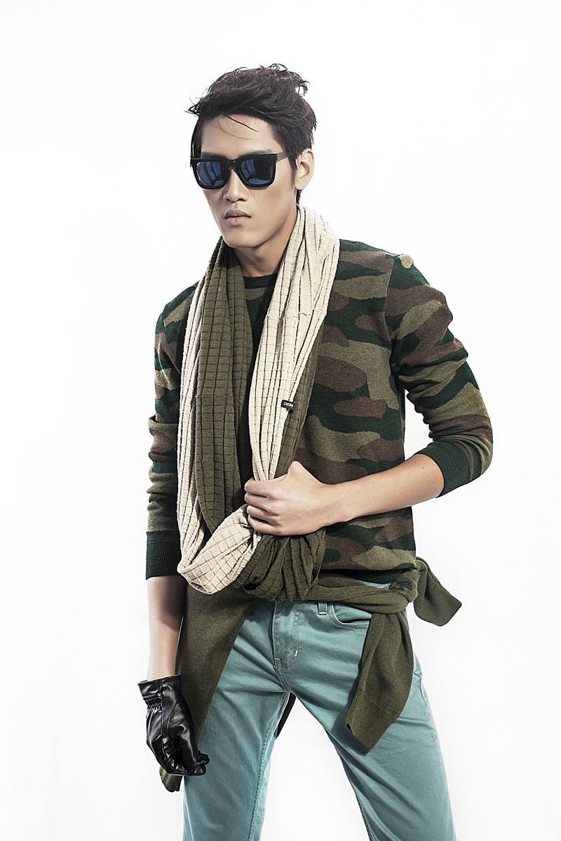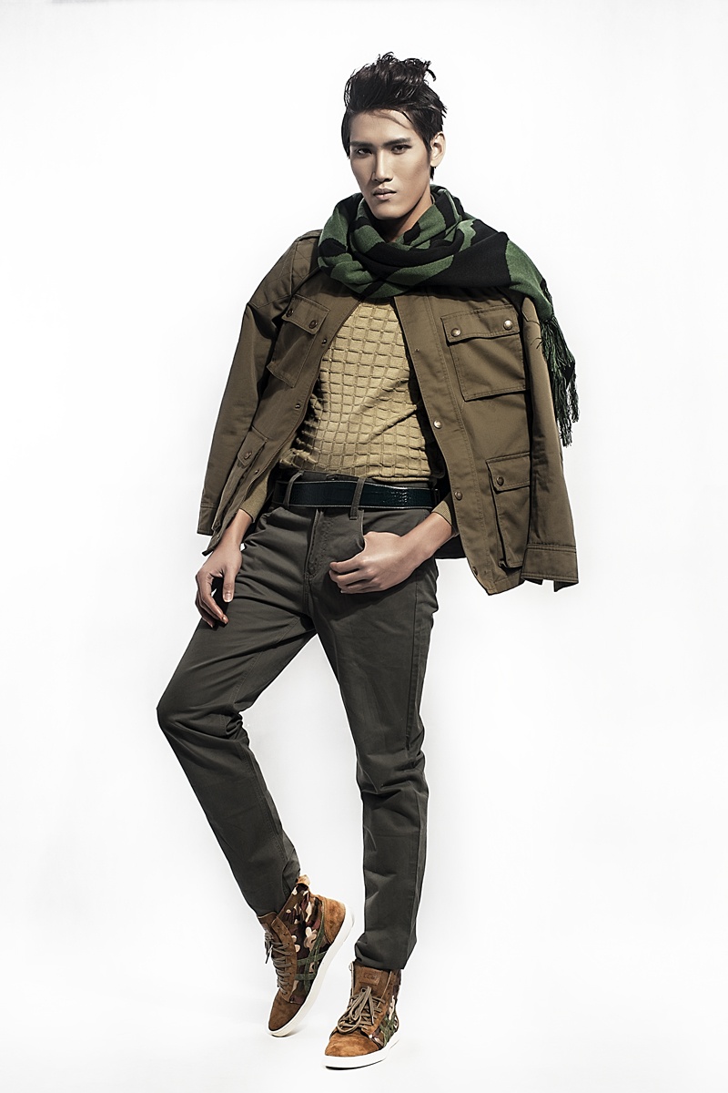 Nam người mẫu trưởng thành từ cuộc thi ''Vietnam's Next top Model'' mới lạ trong trang phục phong cách quân đội khỏe khoắn và nam tính.