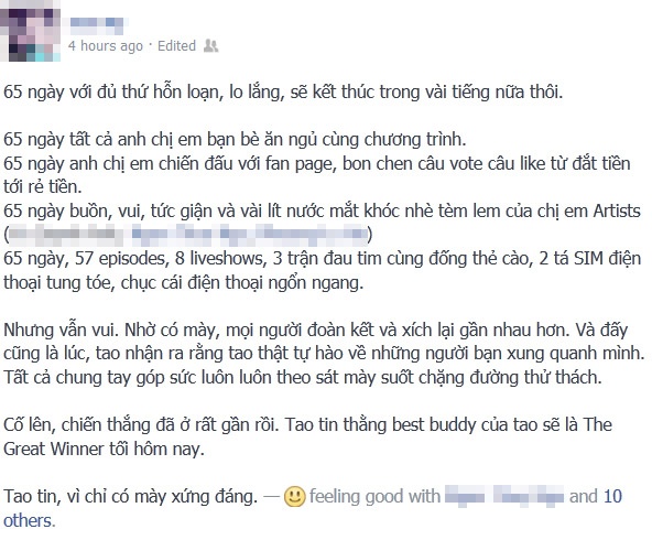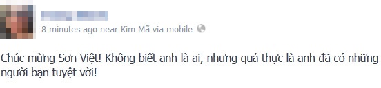 | Chia sẻ của một người khi được chứng kiến sự cổ vũ hết mình của bạn bè dành cho Sơn Việt khi họ cùng tổ chức xem chung kết Người giấu mặt ở một quán nước. |