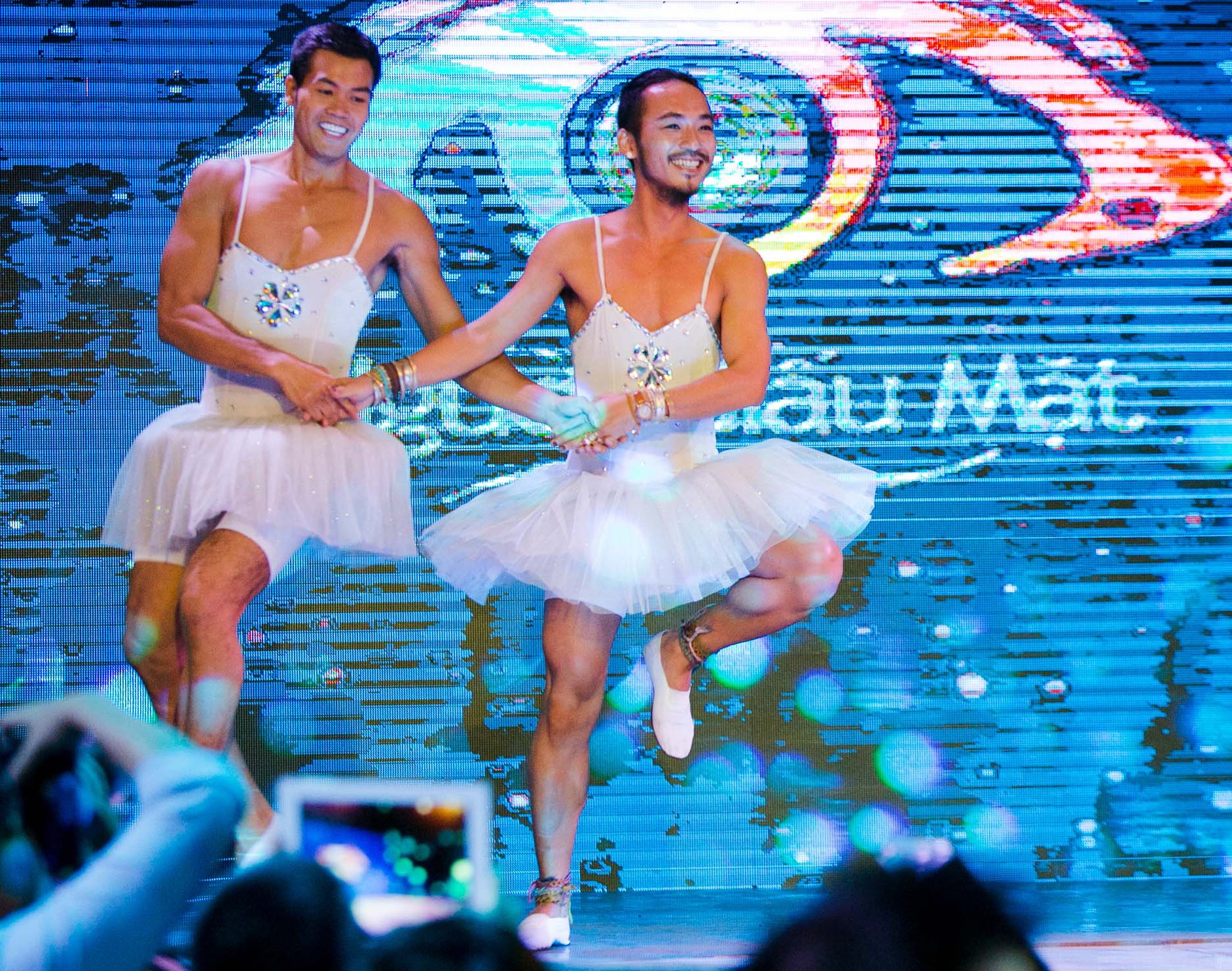 | Chí Bửu và Nguyễn Hiền tái hiện màn vũ đạo của Hồ Thiên Nga - một thử thách của Người giấu mặt khi còn ở ngôi nhà chung. Ảnh: An Trần. |