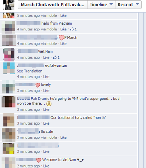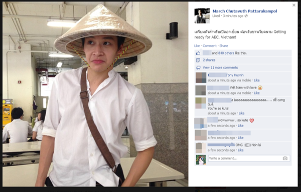 Mới đây, trên Facebook của anh chàng diễn viên March Chutavuth (vai Phu trong Tuổi nổi loạn) đã đăng tải một bức ảnh chụp cùng nón lạ Việt Nam với biểu cảm nhí nhố trên gương mặt. Theo như hình ảnh này, March đăng bức ảnh này lên khi đang trong lớp học ở trưởng. Nam diễn viên cho biết mình đang chuẩn bị cho một sự kiện liên quan đến các nước Đông Nam Á và nhấn mạnh Việt Nam trong status của mình.