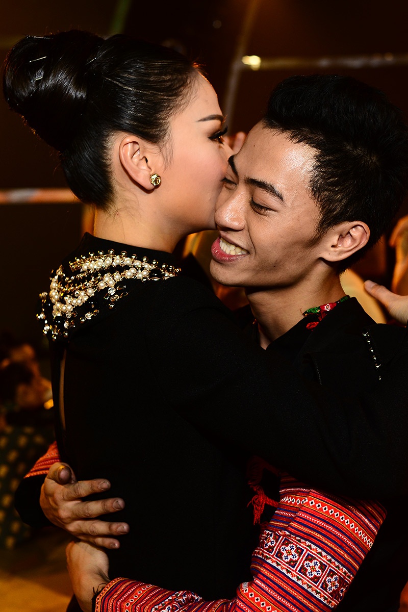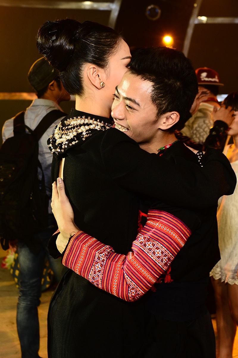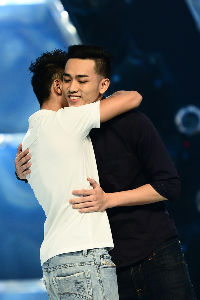 Thu Minh xuống sân khấu tặng Thái Sơn một cái ôm chia buồn. |