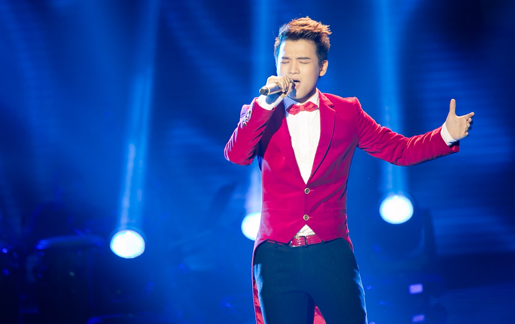 | Hot boy đội Hồ Quỳnh Hương ngày càng tự tin hơn khi biểu diễn. Anh không ngại diện áo vest khoác ngoài có phần cổ khoét sâu, khoe một phần khuôn ngực trên sân khấu. |