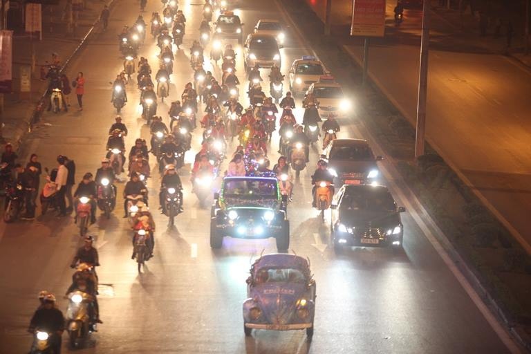 | Đường phố Hà Nội đêm nay rất đông, vì vậy không dễ di chuyển. Đoàn xe này hầu như phải tách nhau mới đến được điểm tập kết. |