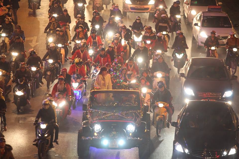 | Dẫn đầu đoàn xe là một chiếc Jeep, theo sau là 15 ông già Noel trên xe phân khối lớn. |