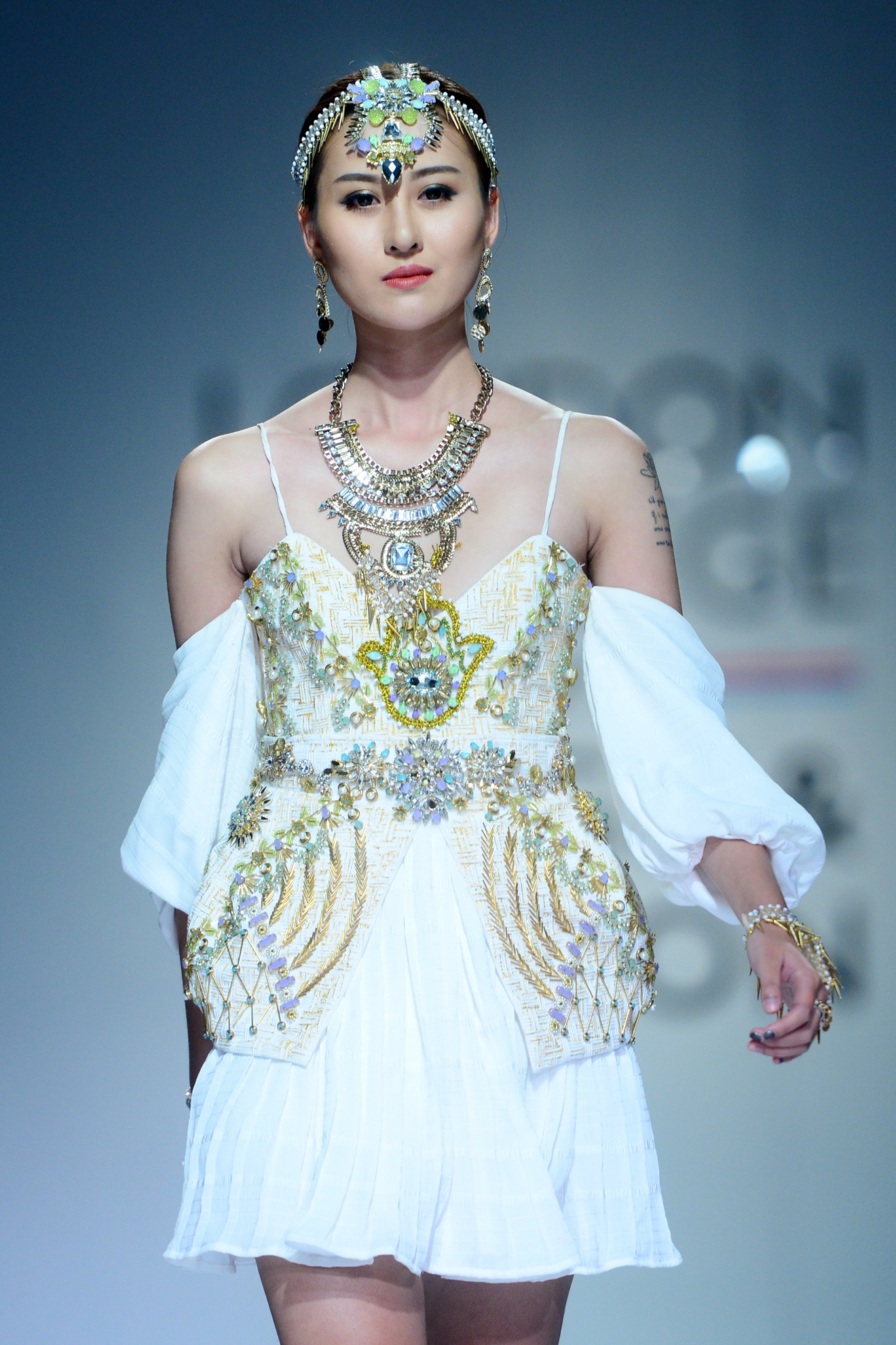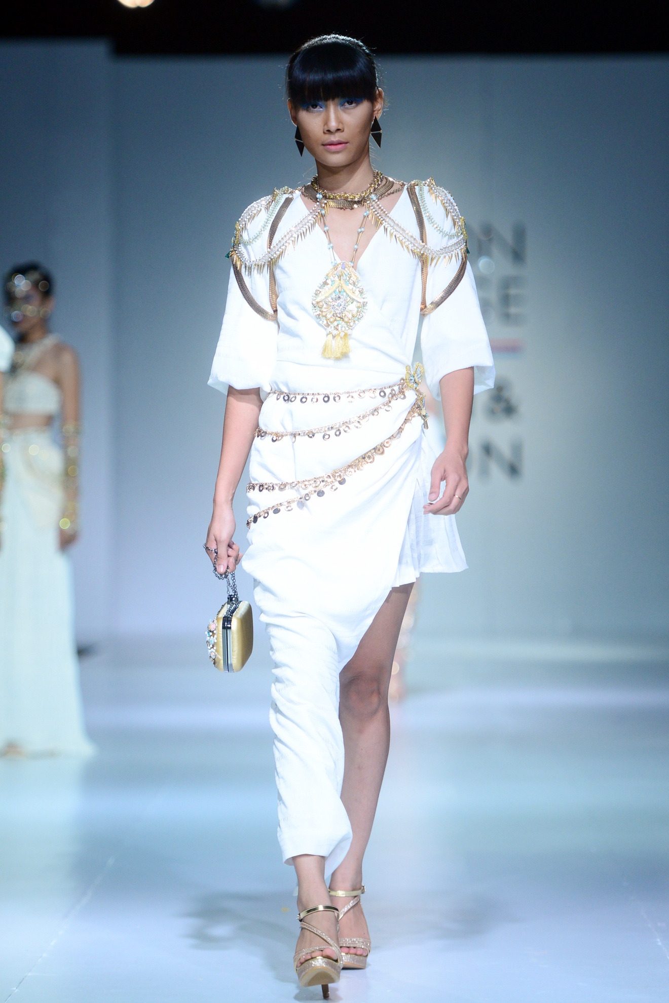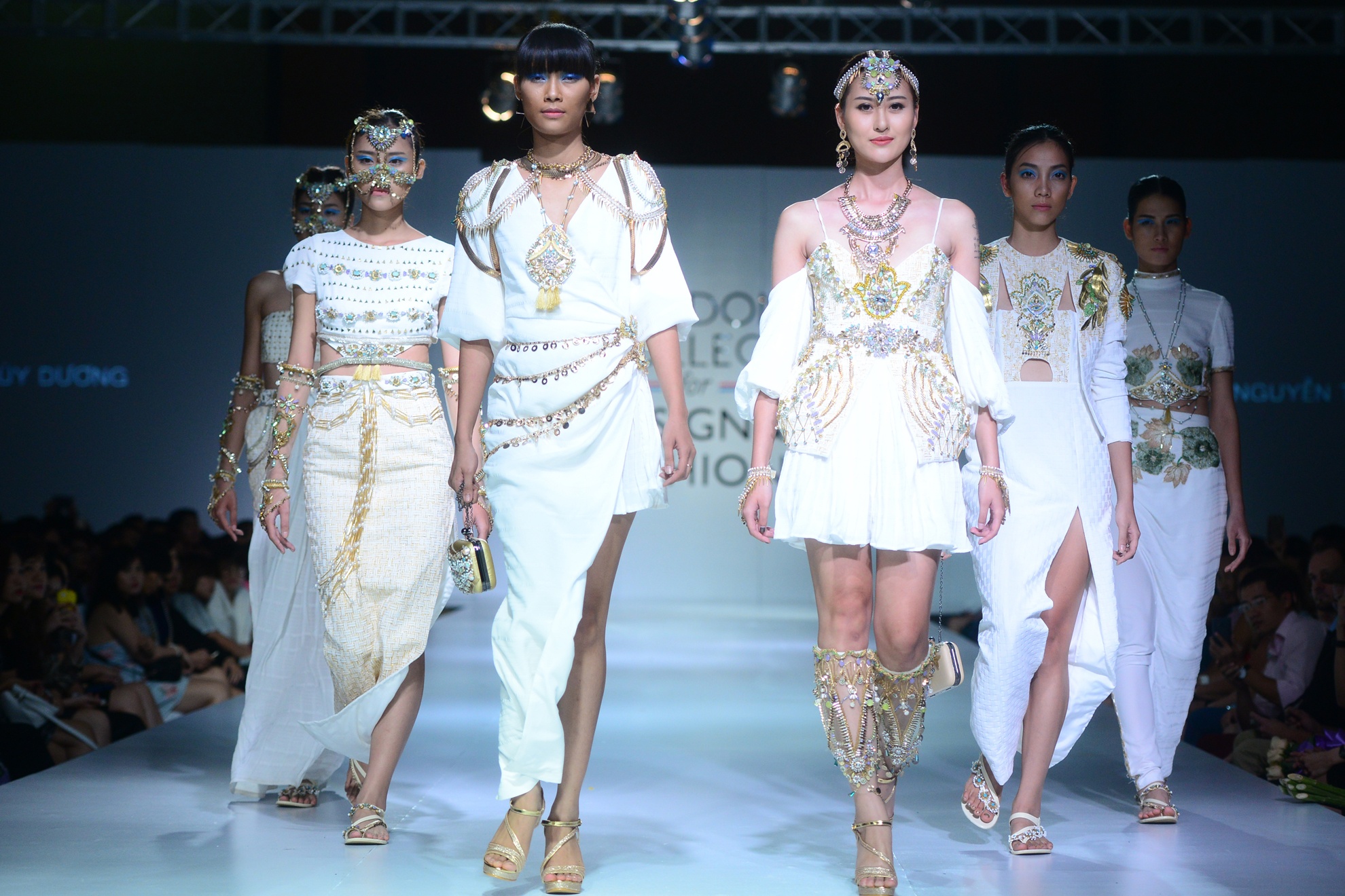| Các mẫu thiết kế mang gam màu trắng và vàng mặc được lấy cảm hứng từ văn hóa Ai Cập. NTK muốn kể lại những câu chuyện thần thoại, lời nguyền hay các phong tục trong văn hóa của đất nước này qua BST. |