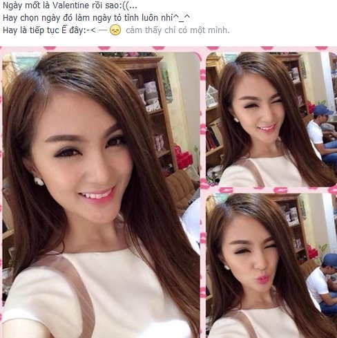 Cận ngày Valentine năm nay, Kelly tiếp tục bày tỏ sự băn khoăn trên mạng xã hội về chuyện tình cảm: “Hãy chọn ngày đó làm tỏ tình luôn nhỉ, hay là tiếp tục ế đây”. Trong một chia sẻ khác cô cũng viết: “Để tiết kiệm thời gian và tiền bạc chúng ta hãy yêu nhau ngay từ cái nhìn đầu tiên”.