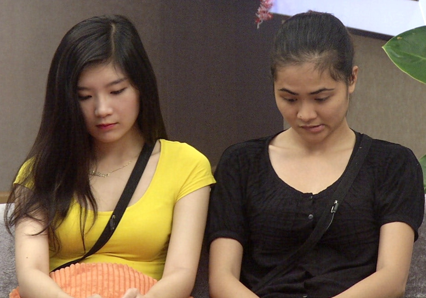 | Quỳnh Trang và Thu Thảo lặng lẽ cúi đầu khi bị người giấu mặt chỉ ra lỗi. |