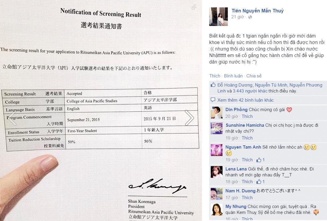 Trải qua màn hỏi đáp khá căng thẳng, 9X vinh dự nhận được học bổng bán phần ngành Văn hóa - Xã hội - Truyền thông của Đại học Ritsumeikan Asia Pacific University (Oita, Nhật Bản). Được nhiều người đánh giá cao, nhưng đây chưa phải kết quả mong muốn của cô gái sinh năm 1996.