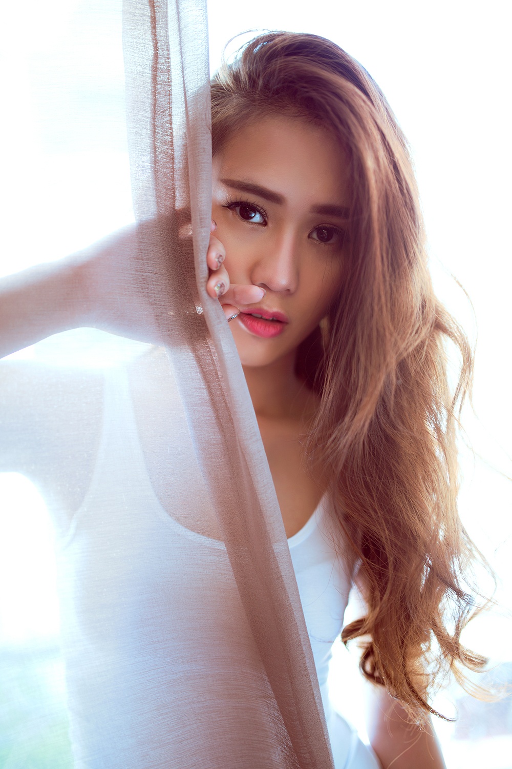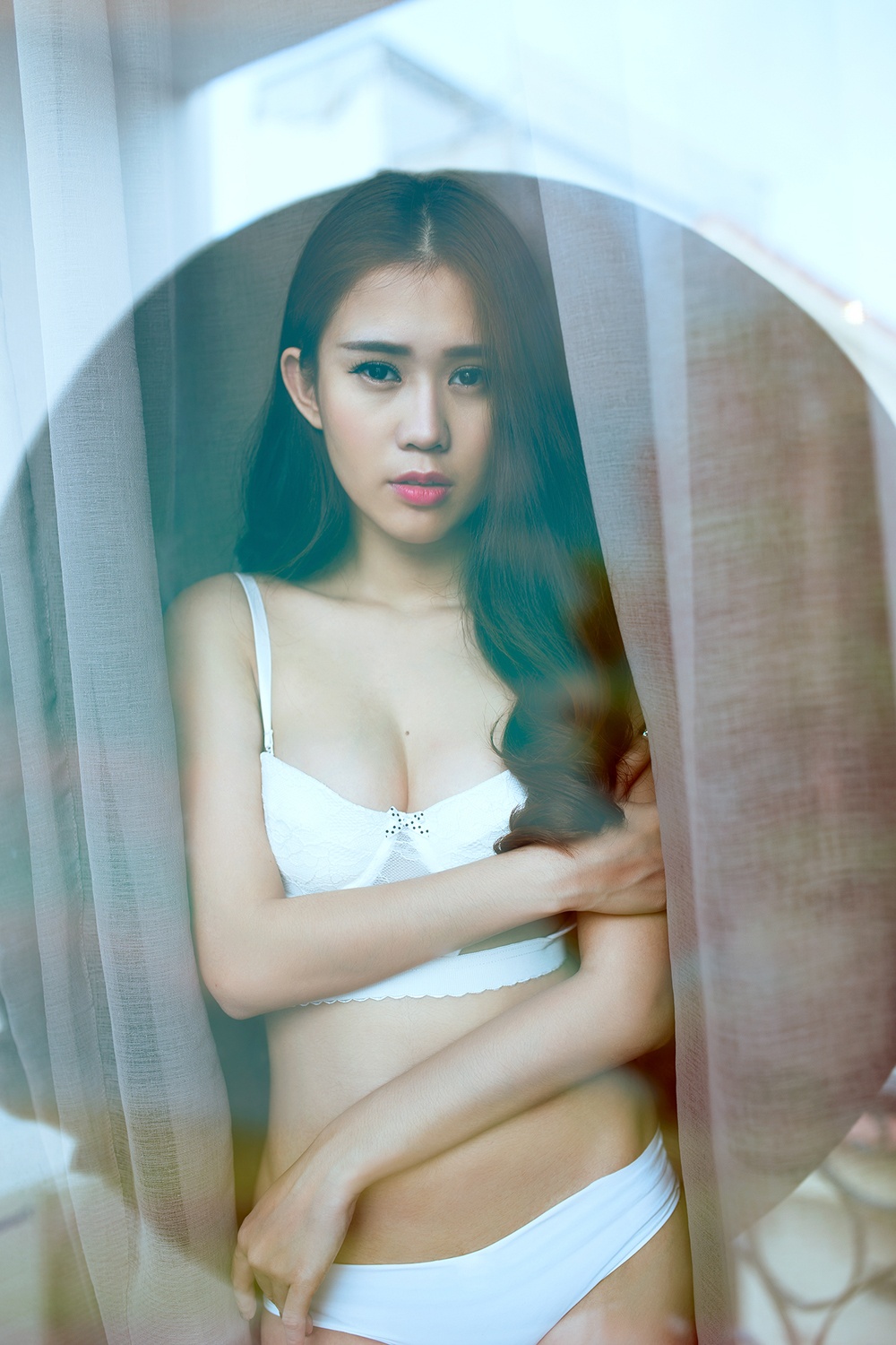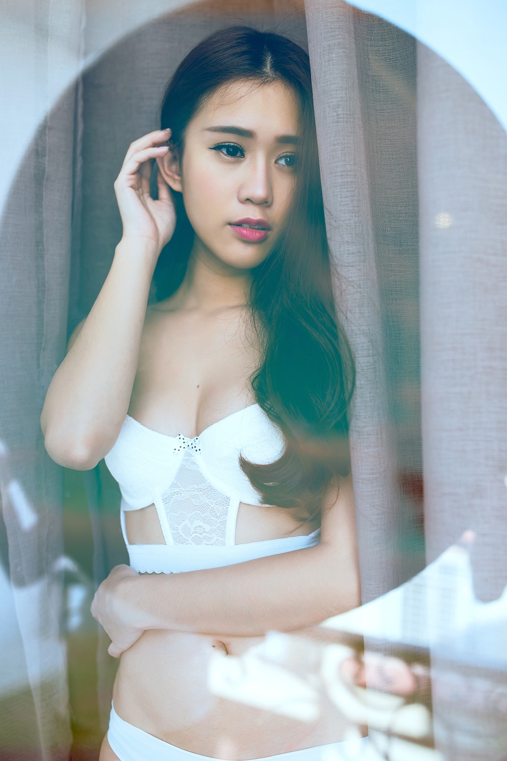 | Trang phục trắng bó sát phù hợp với bối cảnh chụp và chủ đề, định hướng hình tượng trong bộ ảnh. |