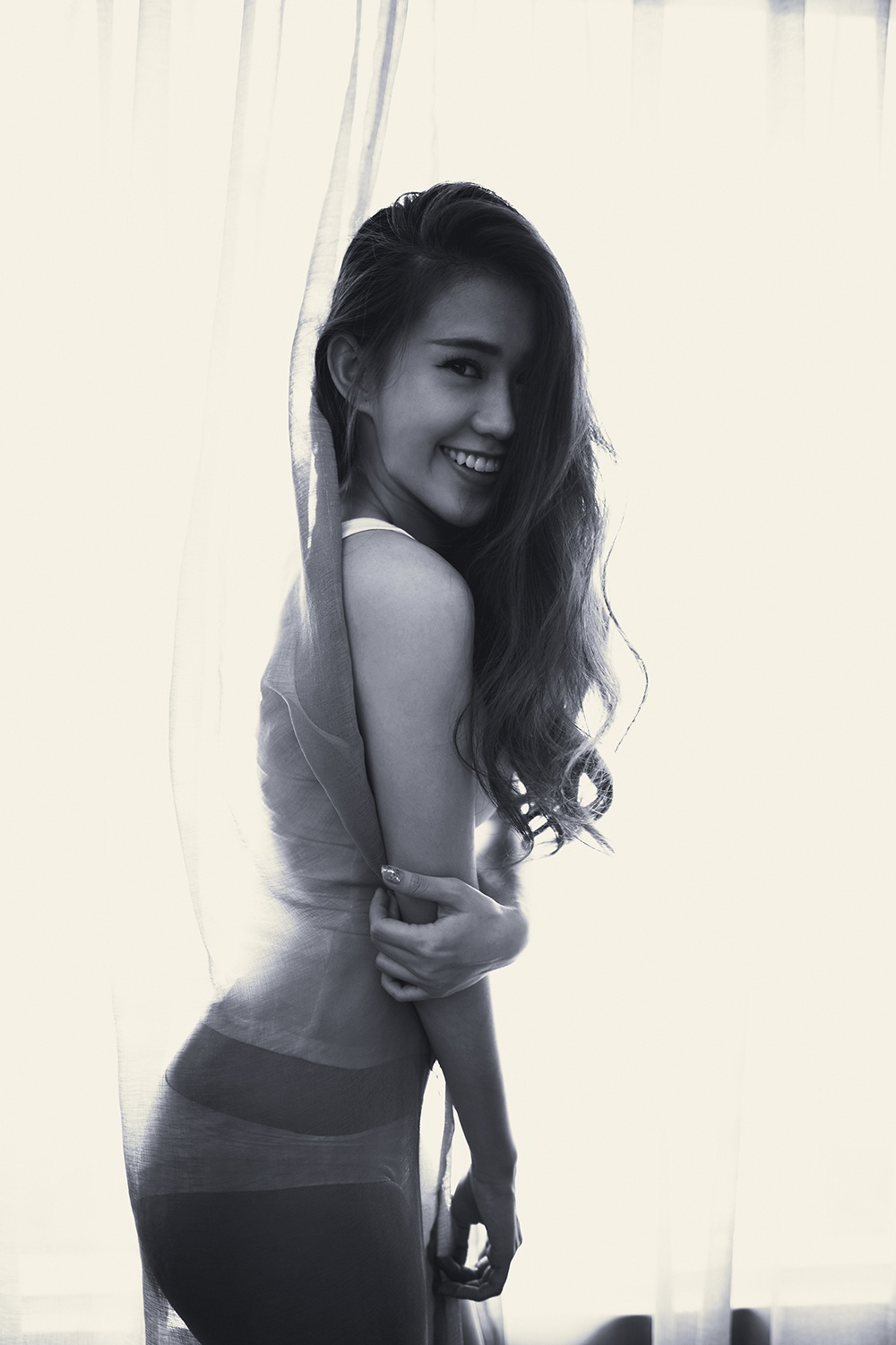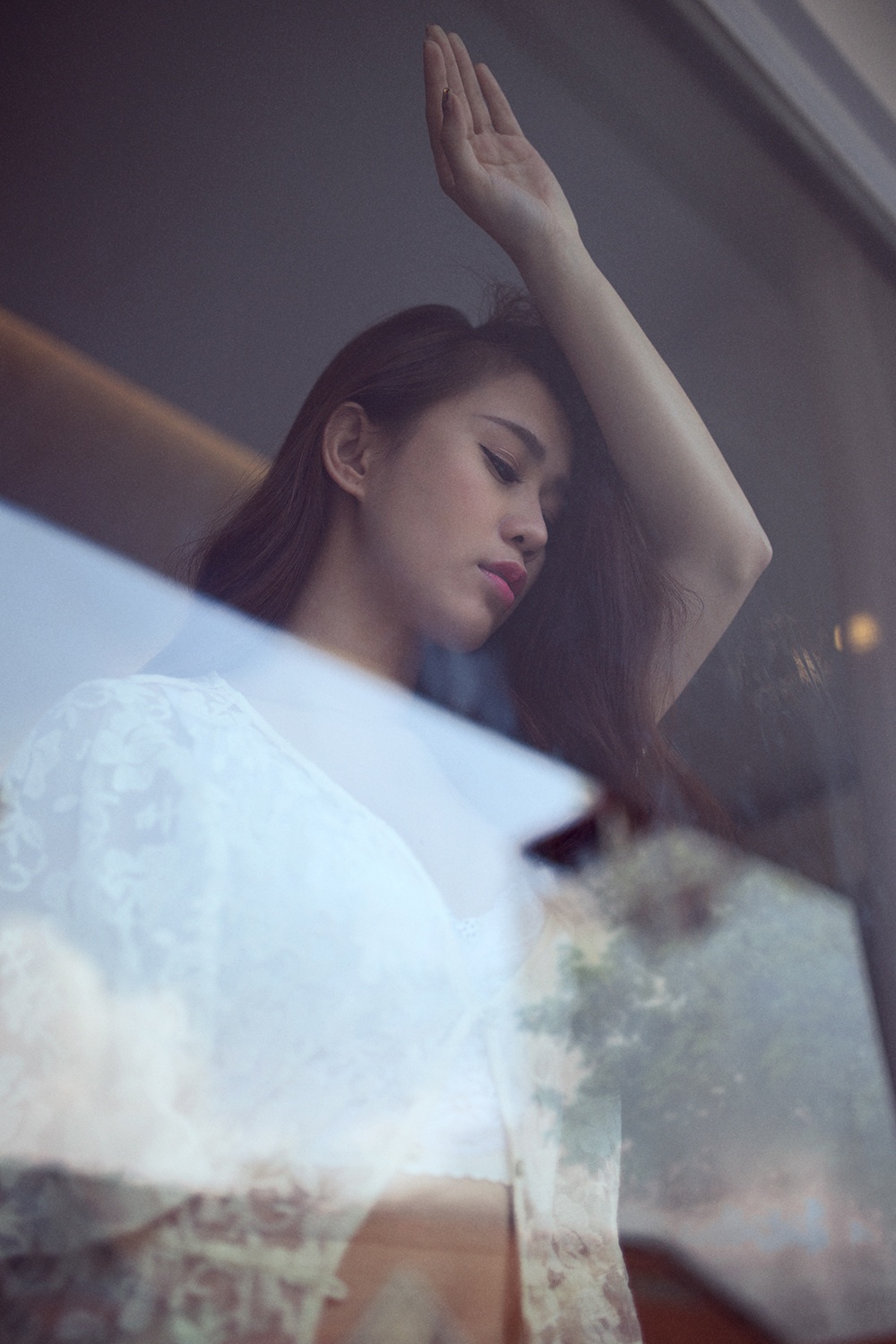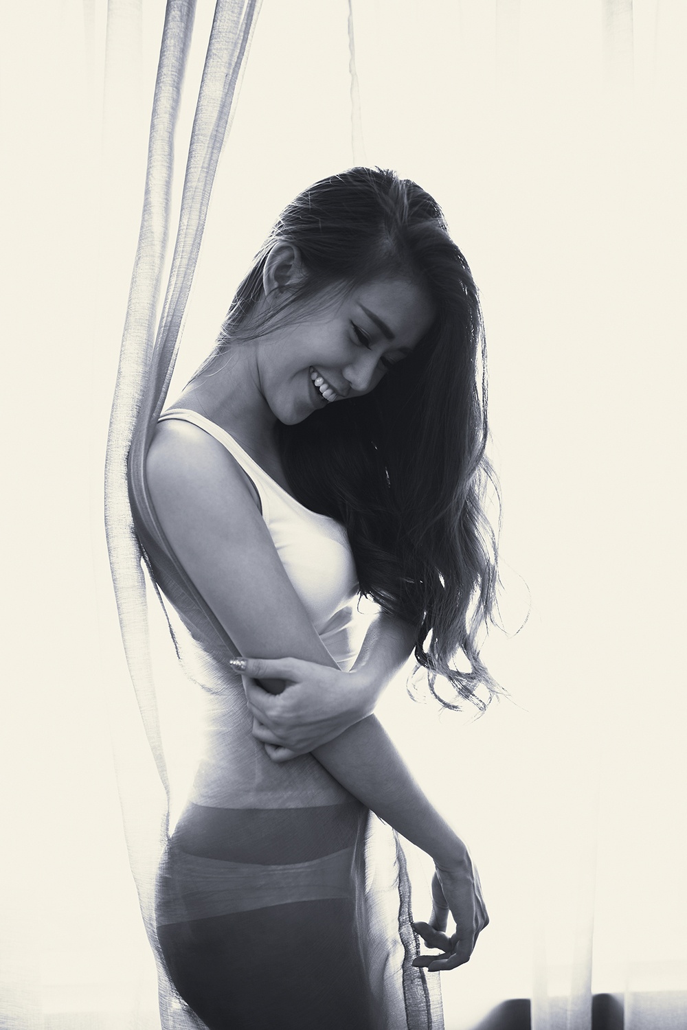 | Trang phục trắng bó sát phù hợp với bối cảnh chụp và chủ đề, định hướng hình tượng trong bộ ảnh. |