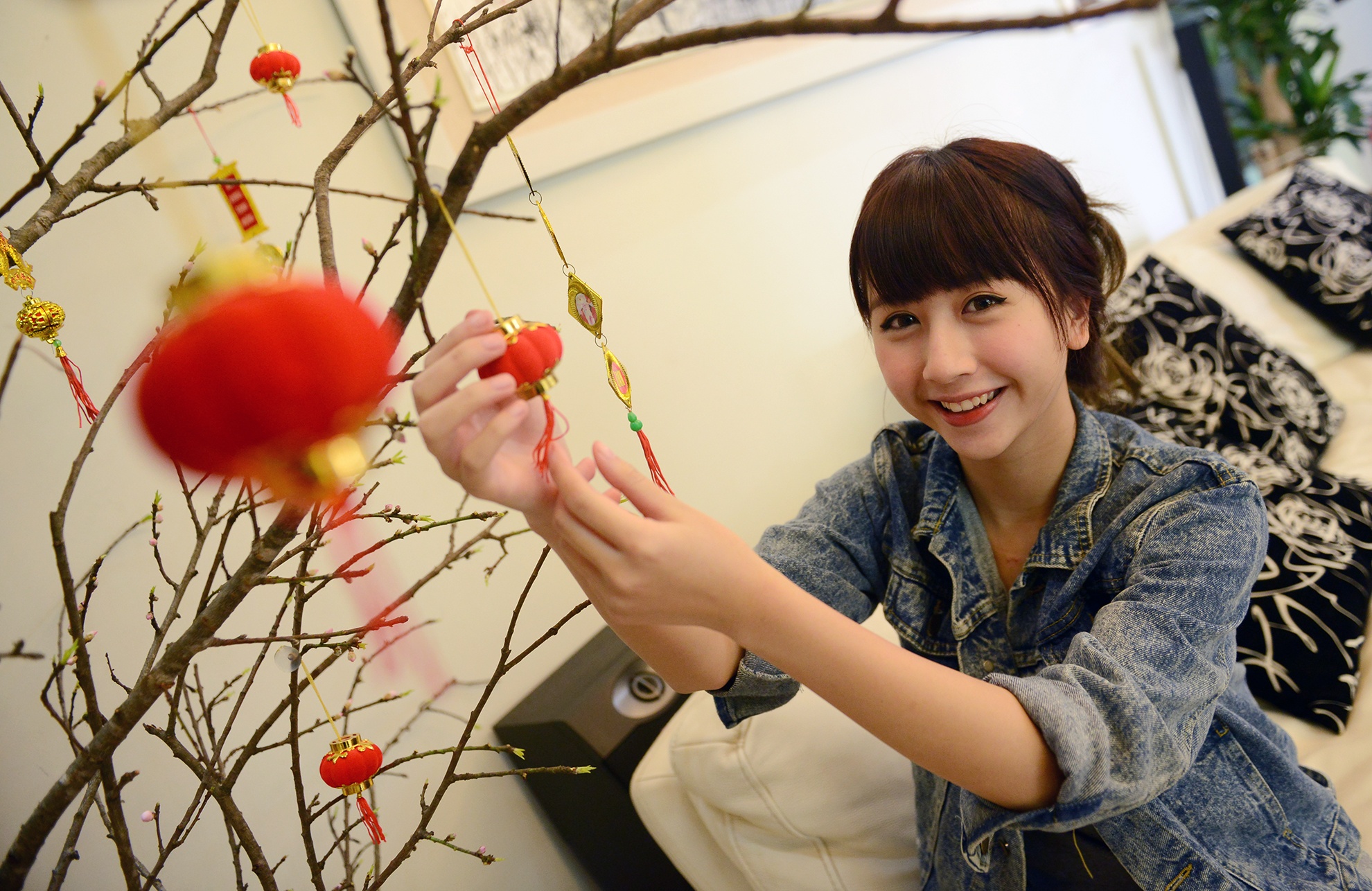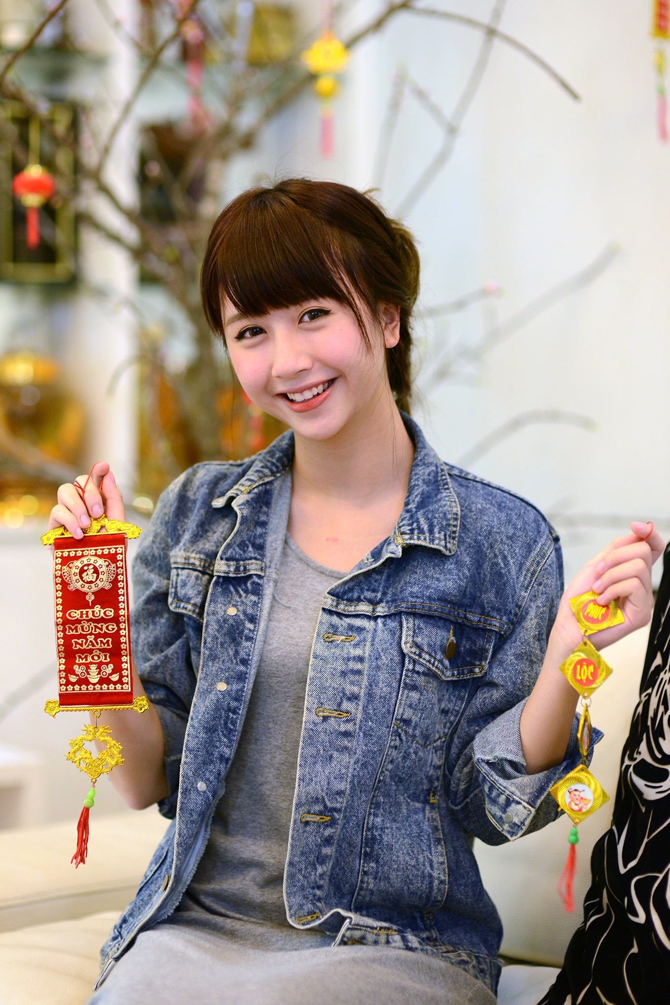 | Quỳnh Anh Shyn trang trí cành đào đón Tết. |