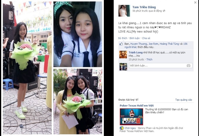 Tam Triều Dâng chia sẻ cảm nhận trong ngày khai giảng khi bước vào ngôi trường THPT Vạn Hạnh, TP.HCM: “Trường mới mang lại cho Dâng cảm giác háo hức, mới mẻ, từ bạn bè thân thiện đến những người thầy cô luôn lắng nghe học sinh. Đặc biệt là cô giáo chủ nhiệm của Dâng".