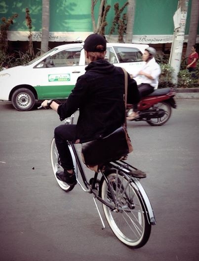 | Hot boy Bình An đạp xe trên đường phố Sài Gòn. Tuy đã cận kề ngày Tết nhưng chàng diễn viên trẻ vẫn bận rộn với lịch quay xa nhà. |