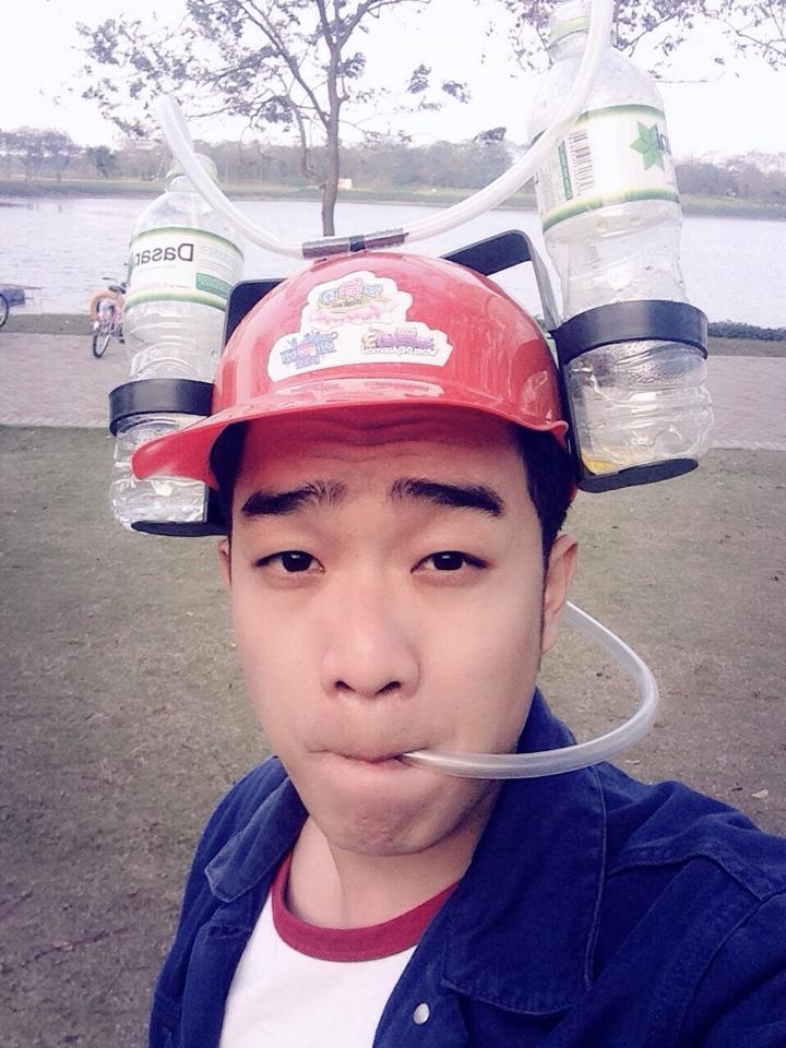 | Diễn viên Duy Nam tạo dáng với chiếc mũ lạ được thiết kế cùng 2 chai nước khoáng. Đây là đạo cụ trong một vai diễn của 9X. |
