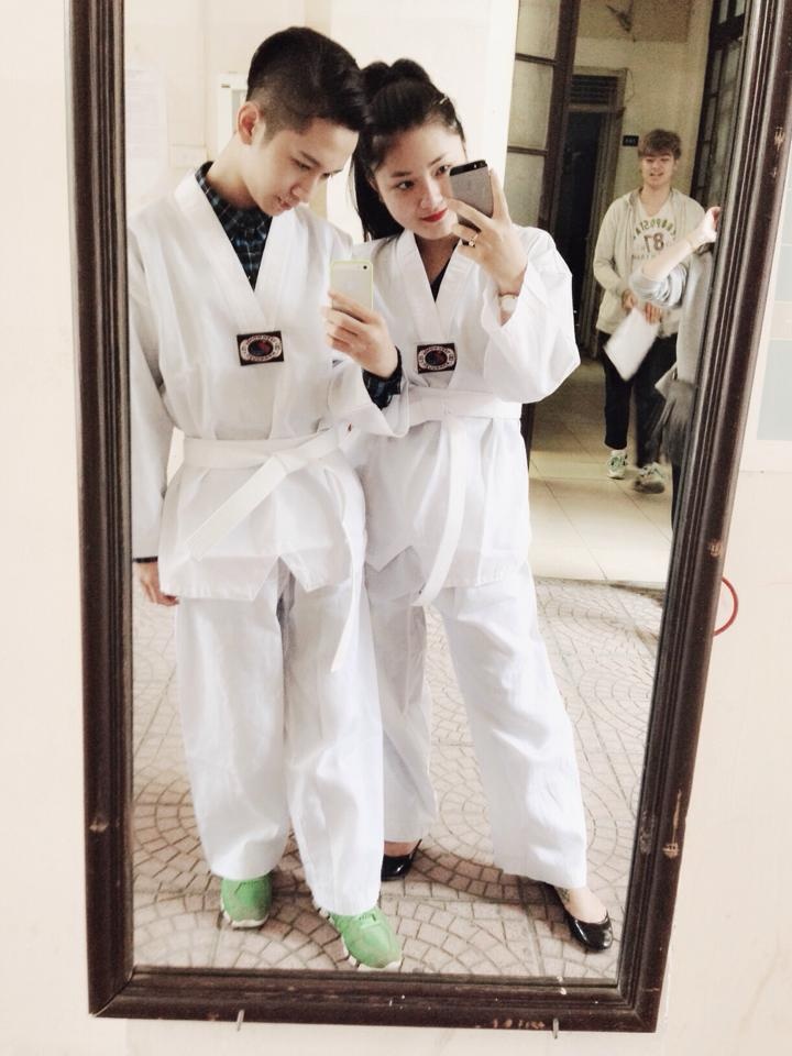 | The Voice Kid Đỗ Hoàng Dương khoe trang phục võ thuật tại trường cùng bạn. Bức ảnh thu hút hơn 20.000 lượt like từ phía cộng đồng mạng. |