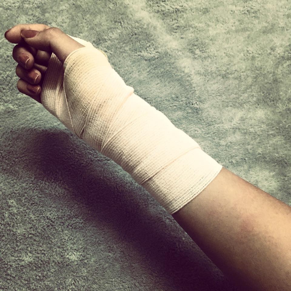| Cũng trong hôm nay, Khả Ngân đăng tải hình ảnh cánh tay bị trật xương. Hot girl cho biết, do vận động mạnh và bất cẩn nên đã gặp phải tính huống không mong muốn này. |