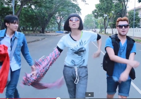 | Bảo Bảo (ở giữa) và người yêu (tay phải) trong clip "Anh không đòi quà". |