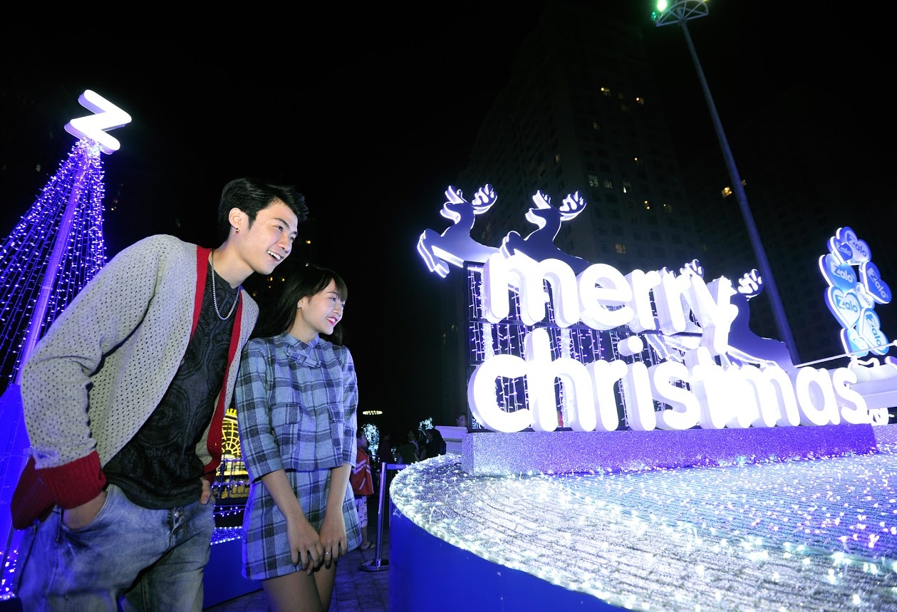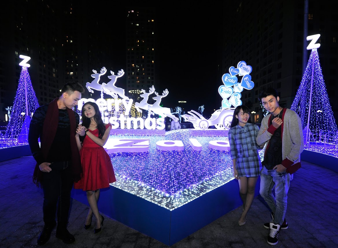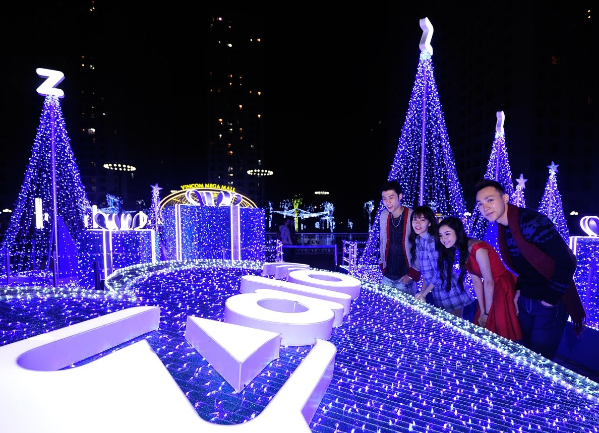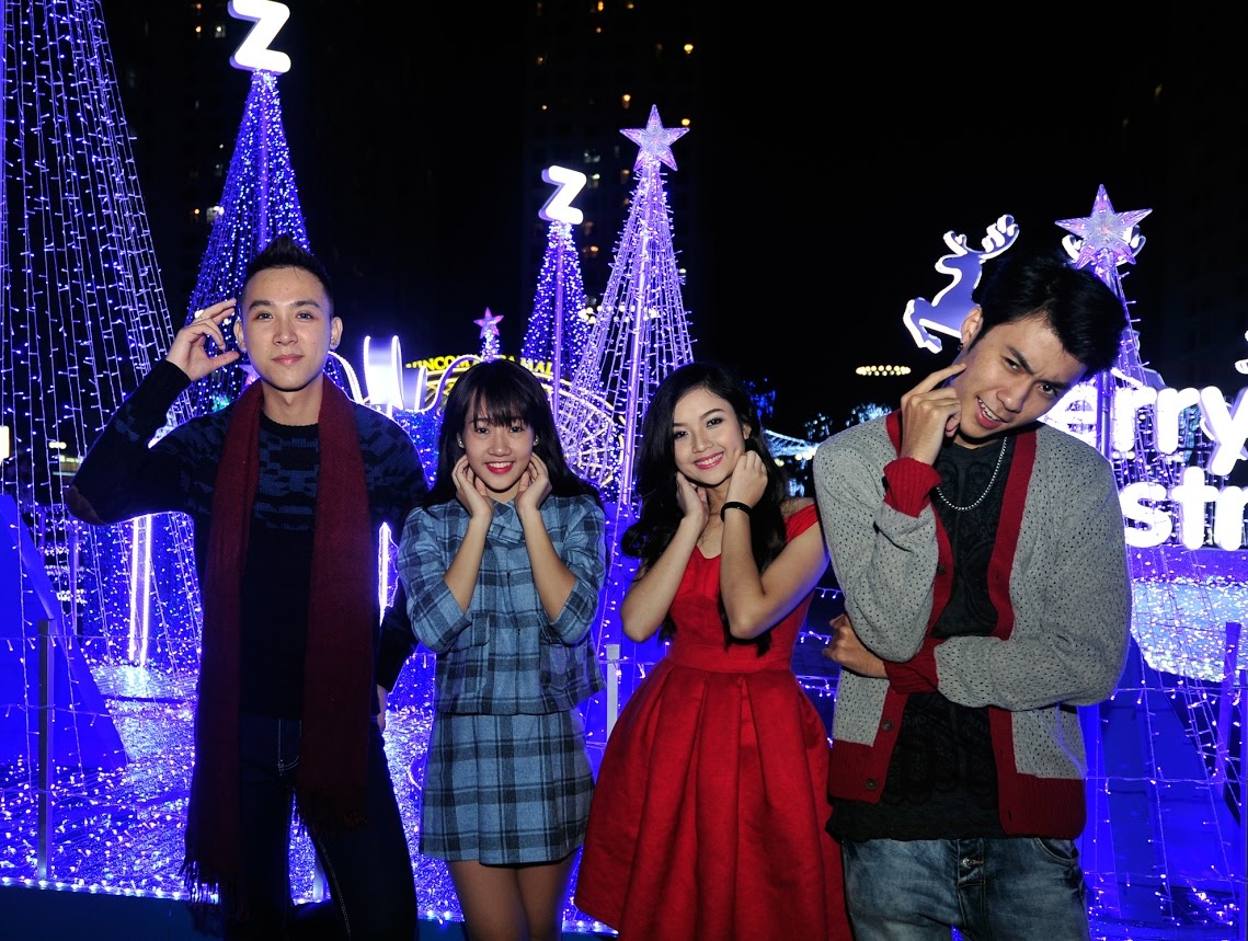 | Nhóm của Vương Anh Ole là những bạn trẻ đầu tiên "khai trương" khu chụp hình Giáng sinh lung linh sắc màu tại Times City. |