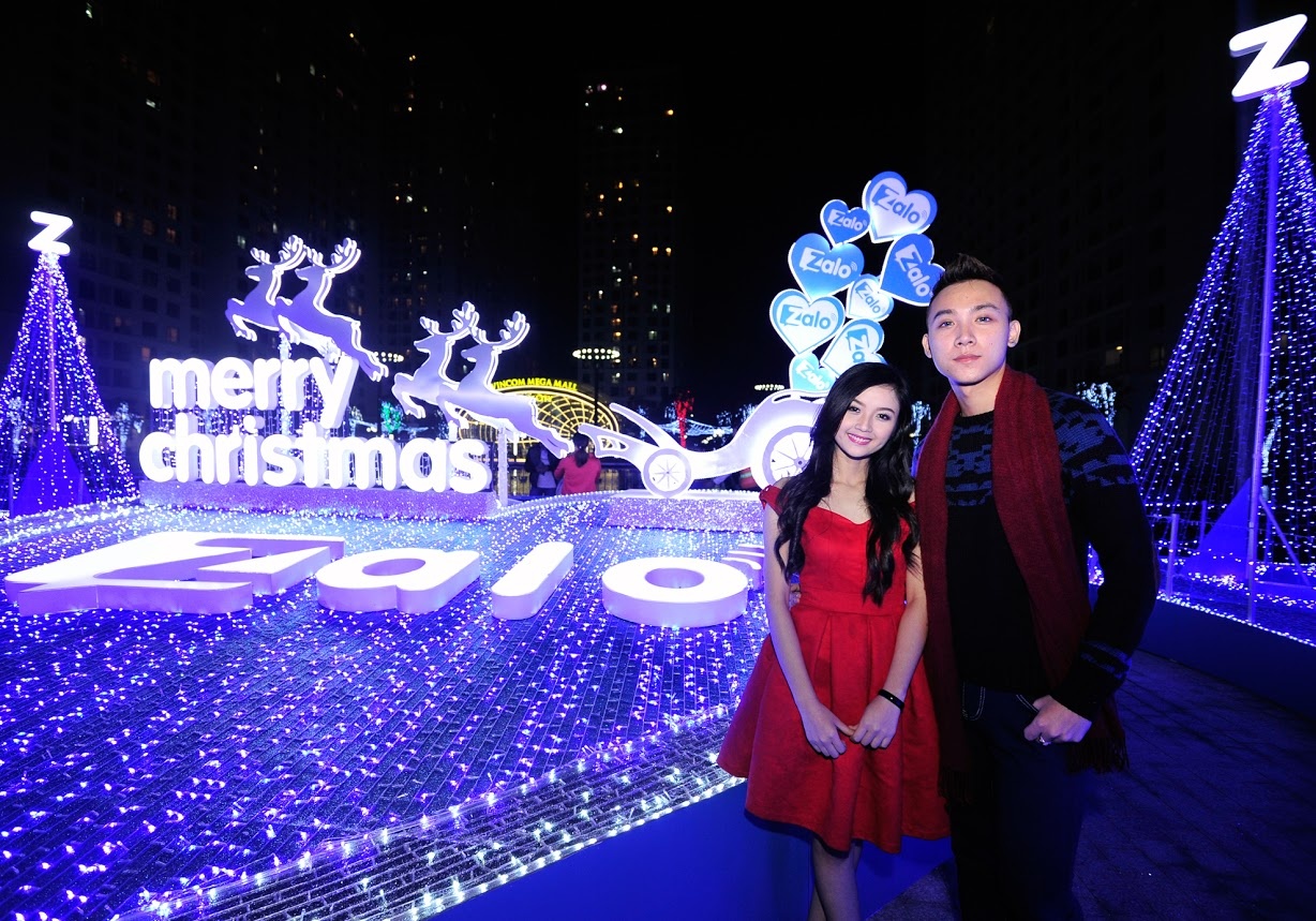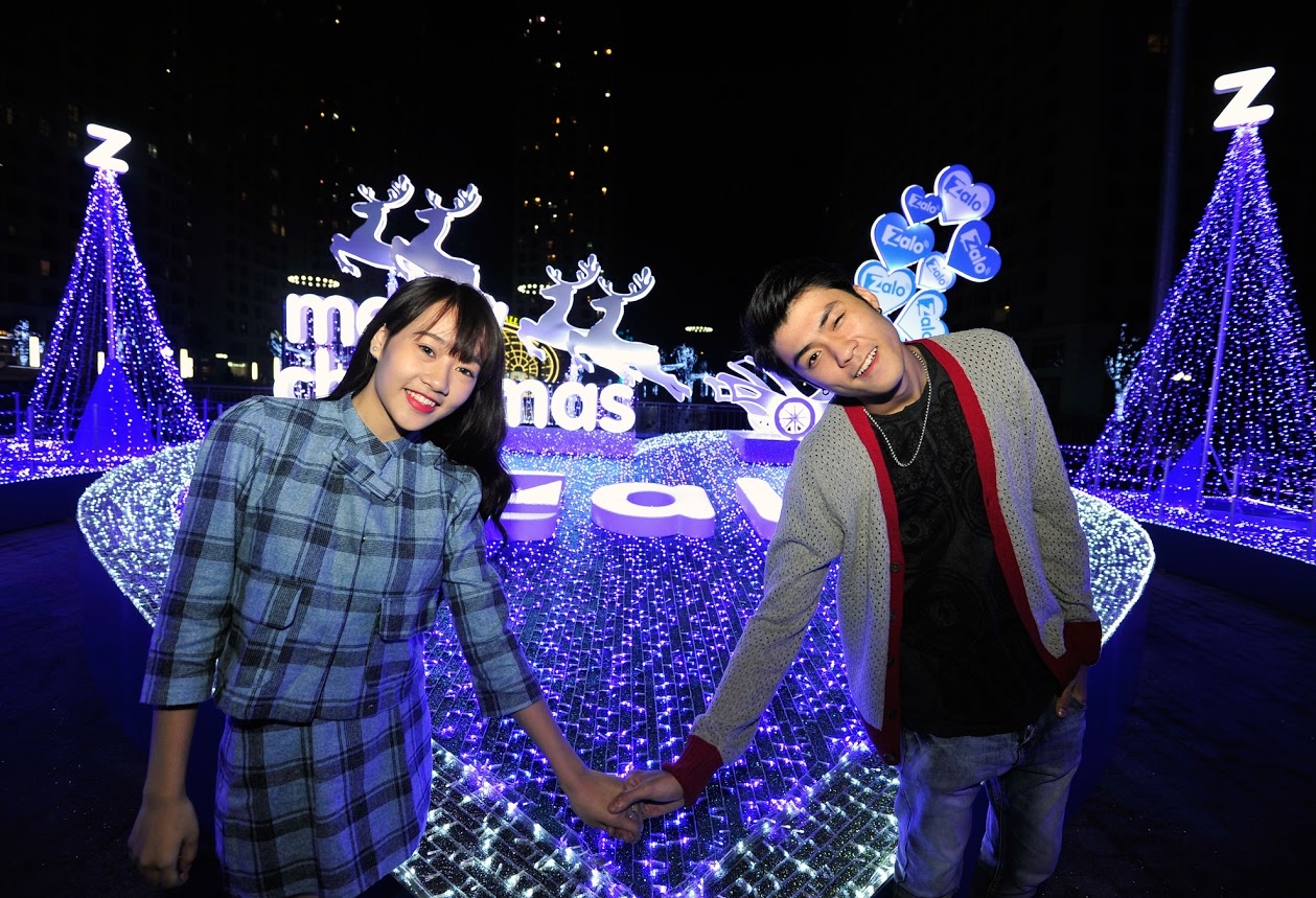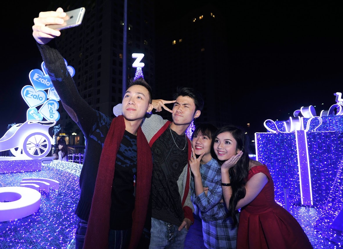 | Nhóm của Vương Anh Ole là những bạn trẻ đầu tiên "khai trương" khu chụp hình Giáng sinh lung linh sắc màu tại Times City. |