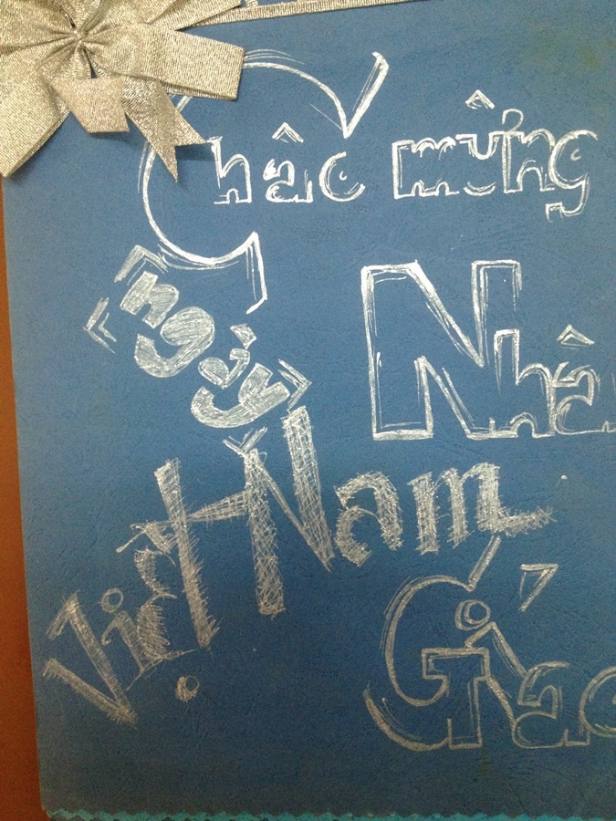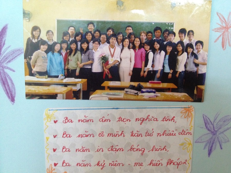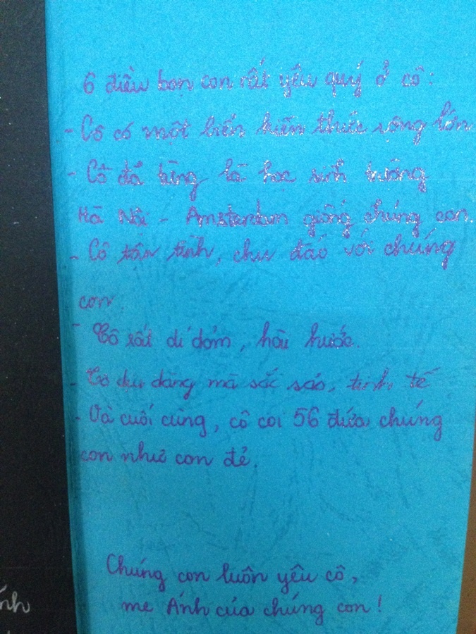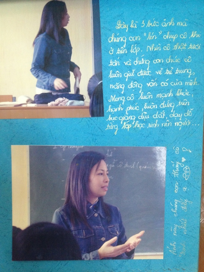 | Một cách thể hiện tình cảm rất đáng yêu của học sinh. Các em viết: "Đây là bức ảnh chúng con lén chụp cô khi ở trên lớp. Nhìn cô thật tươi tắn và chúng con chúc cô luôn giữ được vẻ trẻ trung, năng động vốn có của mình. Mong cô luôn mạnh khỏe, hạnh phúc, luôn đứng trên bục giảng dạy dỗ từng lớp học sinh nên người". |