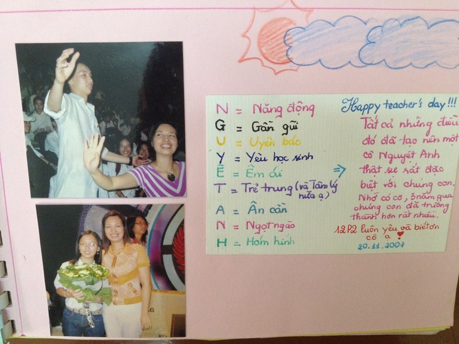 Cô Nguyệt Anh là giáo viên dạy Ngữ văn trường THPT Hà Nội – Amsterdam vốn nổi tiếng với những đề văn khơi gợi trí tưởng tượng. Qua 22 năm dạy học, mỗi dịp 20/11 về cô đều nhận được những món quà do tự tay học sinh thiết kế.