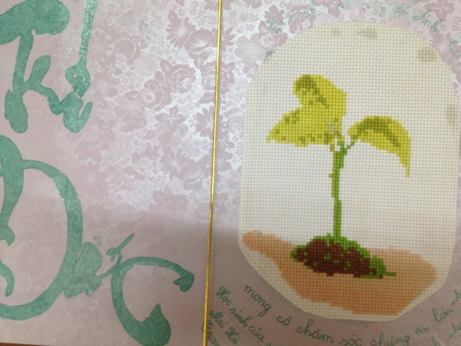 | Tấm thiệp độc đáo do phụ huynh và học sinh Thanh Trang cùng kết hợp làm tặng cô giáo. Hình ở gữa là tranh thêu biểu tượng mầm non tươi xanh cùng những hình vẽ và nét chữ xung quanh. |