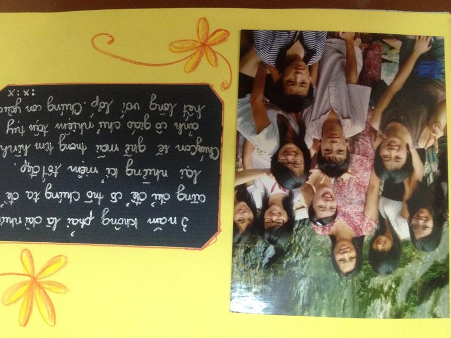 | Một trang trong cuốn sổ lưu niệm dành tặng cô giáo: "Ba năm không phải là dài nhưng đủ để cô trò chúng ta để lại những kỷ niệm tốt đẹp. Chúng con sẽ giữ mãi trong tim hình ảnh cô giáo chủ nhiệm tận tụy hết lòng với lớp. Chúng con yêu cô". |