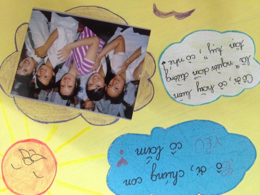 | Những tác phẩm trên "cây yêu thương" giành tặng cô giáo. Đây cũng là món quà khiến cho cô giáo Nguyệt Anh ghi nhớ nhất. Cô kể lại: "Vào ngày 20/11, khi cô bước đến cửa lớp thì cửa đã đóng, lớp học im phăng phắc. Bỗng nhiên khi mở cửa thì các em òa ra, mỗi người cầm một bông hoa tặng cô. Trong lớp, các em còn làm "cây yêu thương" để bày tỏ tình cảm với cô". |