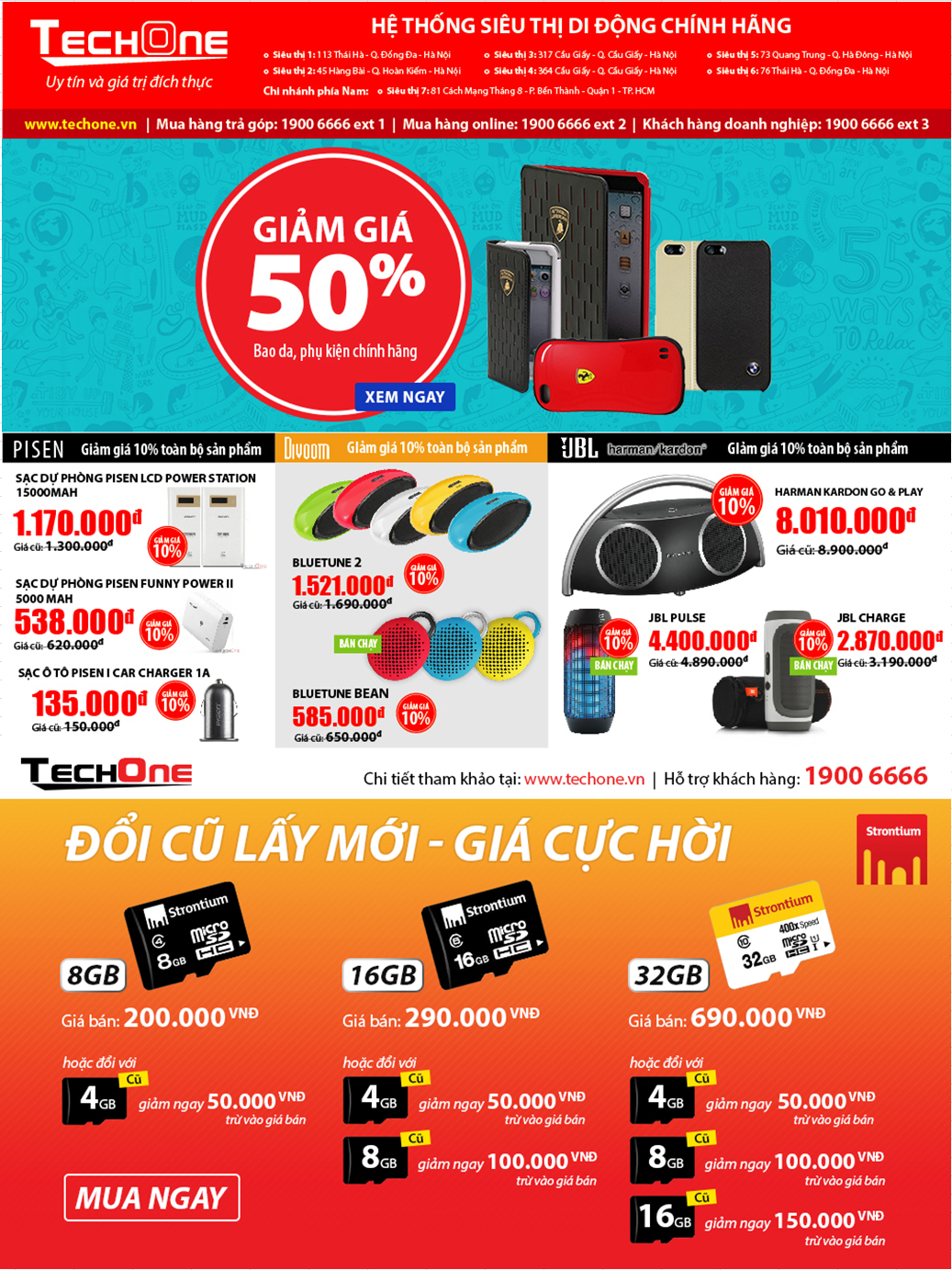 Khi đến với TechOne trong thời gian này, khách hàng sẽ còn tham gia rất nhiều chương trình khuyến mại đặc biệt khác như mua điện thoại trúng điện thoại, giờ vàng giá sốc, giảm giá cực sốc khi mua phụ kiện…