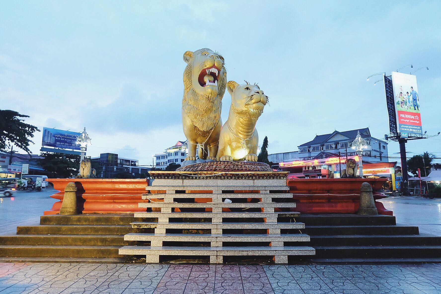 Buổi tối, nhóm đi tuk tuk ra khu trung tâm, chỗ có 2 con sư tử. Ở đấy có khá nhiều nhà hàng, cứ xem menu thấy hợp lý thì vào ăn. Quanh đây cũng nhiều mini mart, có đầy đủ các thứ cần thiết với giá cả hợp lý.