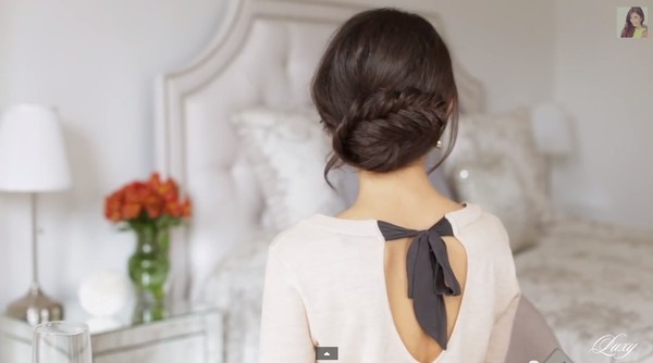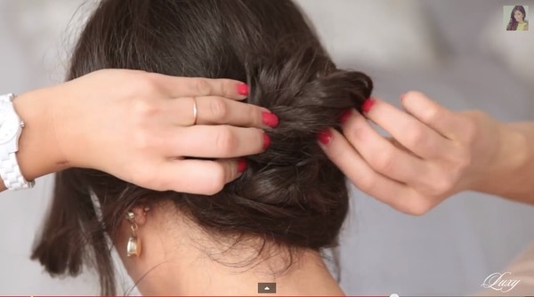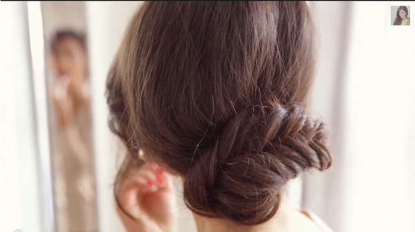 | Bước 3. Lấy đuôi tóc đã tết ra sa gáy, gập làm đôi (đuôi tóc ở phía trong, không lộ ra ngoài) và dùng kẹp ghim cố định phần tóc. |