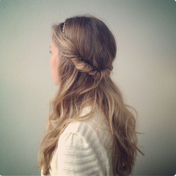 Tóc xoắn buộc nửa phảng phất nét nữ tính và mộng mơ, trông bạn sẽ thật tuyệt khi kết hợp cùng với những chiếc váy tông màu pastel nhẹ nhàng, thanh lịch và phong cách trang điểm đơn giản, ngọt ngào.