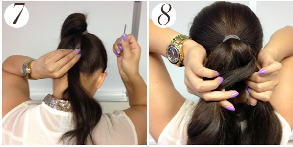 | Sau khi buộc tóc đuôi ngựa gọn gàng, bạn lấy một lọn tóc nhỏ, dùng ghim để kẹp lọn tóc này ra phía trước. Sau khi tết xong, lọn tóc này sẽ được quấn quanh phần tóc cột, tạo thành một chiếc dây buộc bằng tóc. |